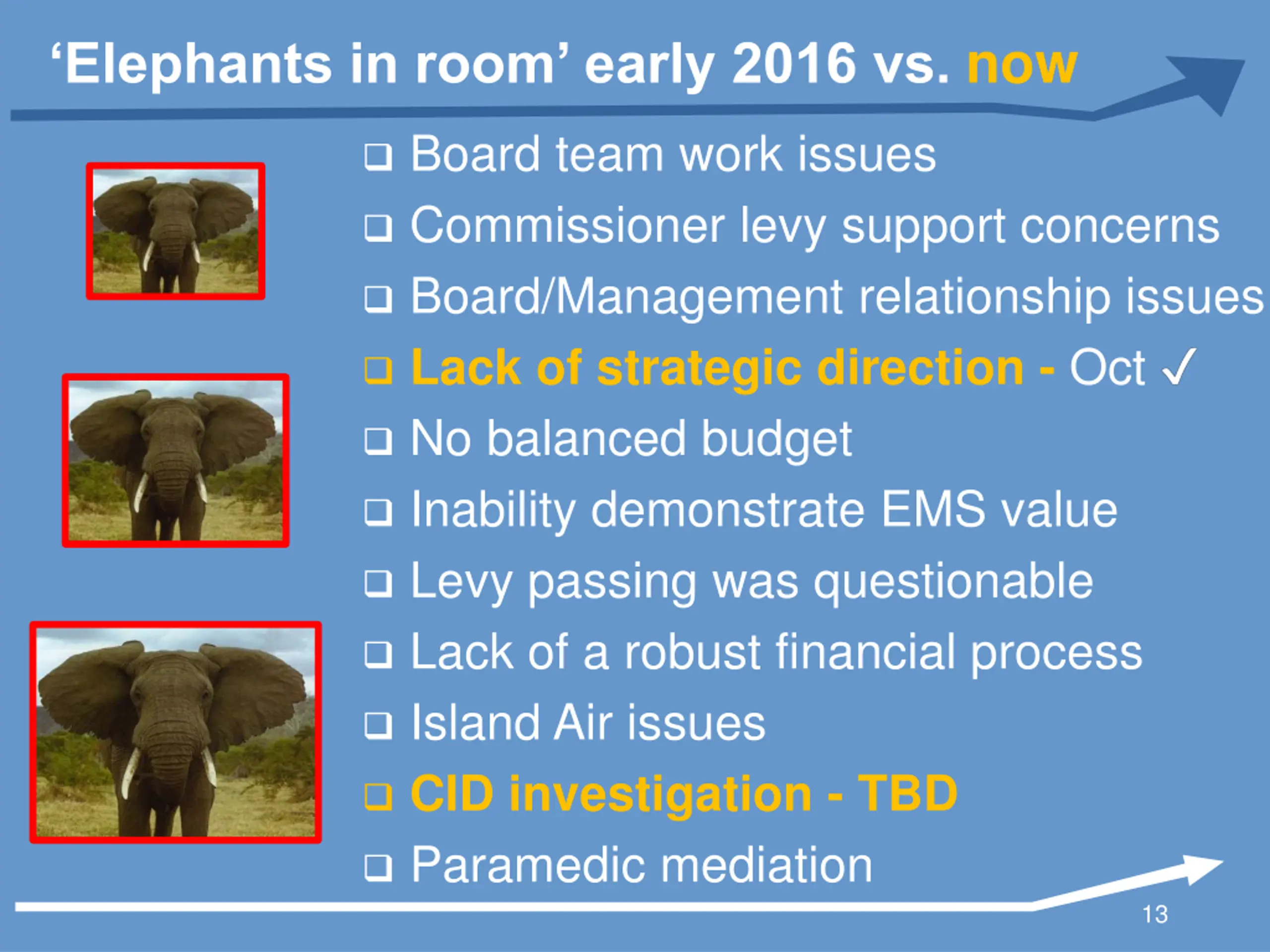 Elephants in room early 2016 vs. now Board team work issues Commissioner levy support concerns Board/Management relationship issues Lack of strategic direction - Oct No balanced budget Inability demonstrate EMS value Levy passing was questionable Lack of a robust financial process Island Air issues CID investigation - TBD Paramedic mediation 13