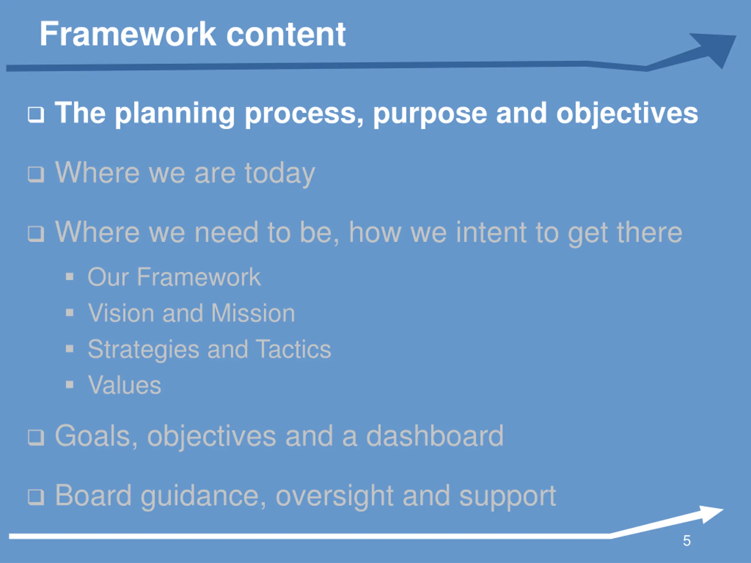 Framework content The planning process, purpose and objectives Where we are today Where we need to be, how we intent to get there Our Framework Vision and Mission Strategies and Tactics Values Goals, objectives and a dashboard Board guidance, oversight and support 4