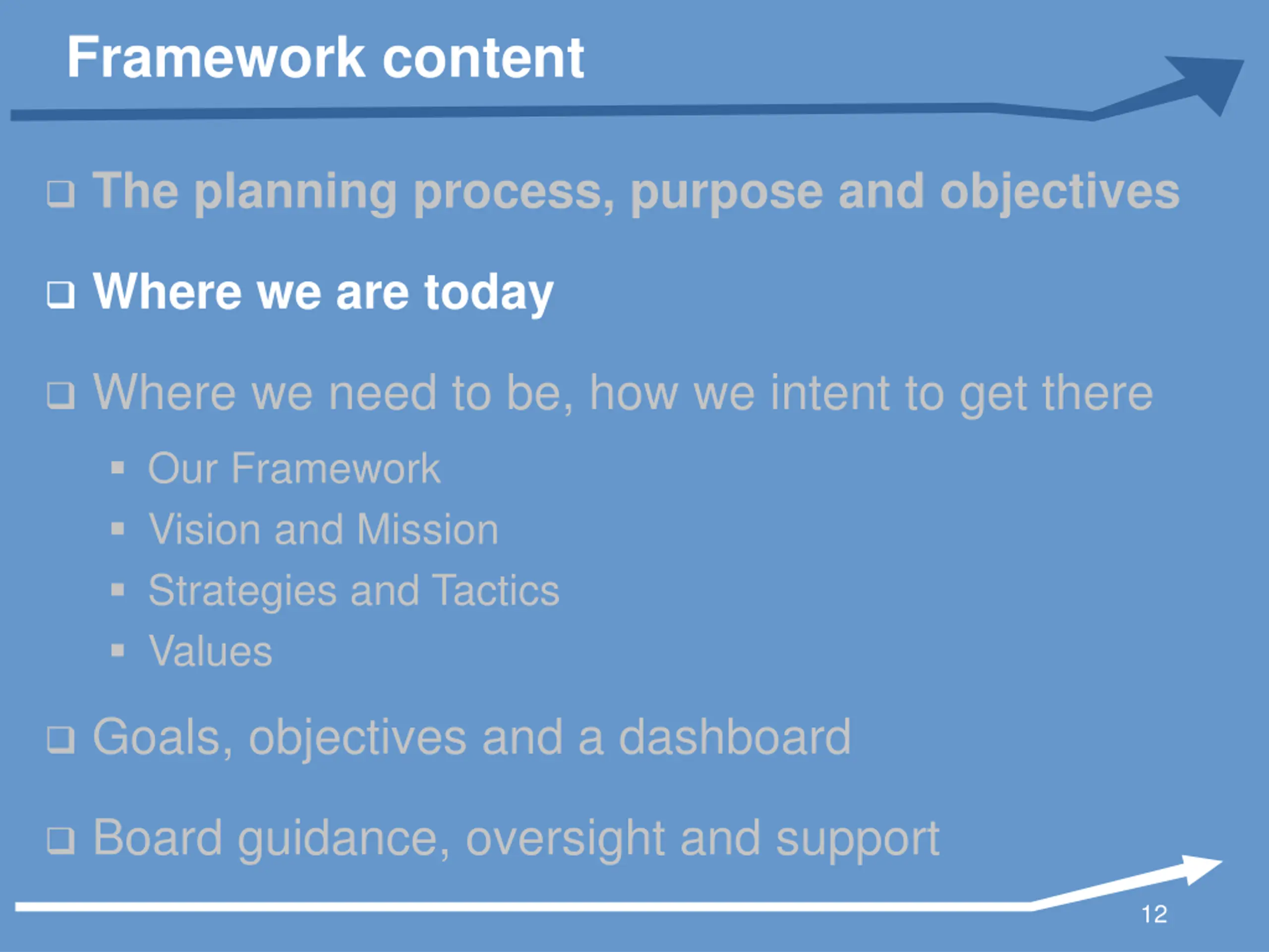 Framework content The planning process, purpose and objectives Where we are today Where we need to be, how we intent to get there Our Framework Vision and Mission Strategies and Tactics Values Goals, objectives and a dashboard Board guidance, oversight and support 12