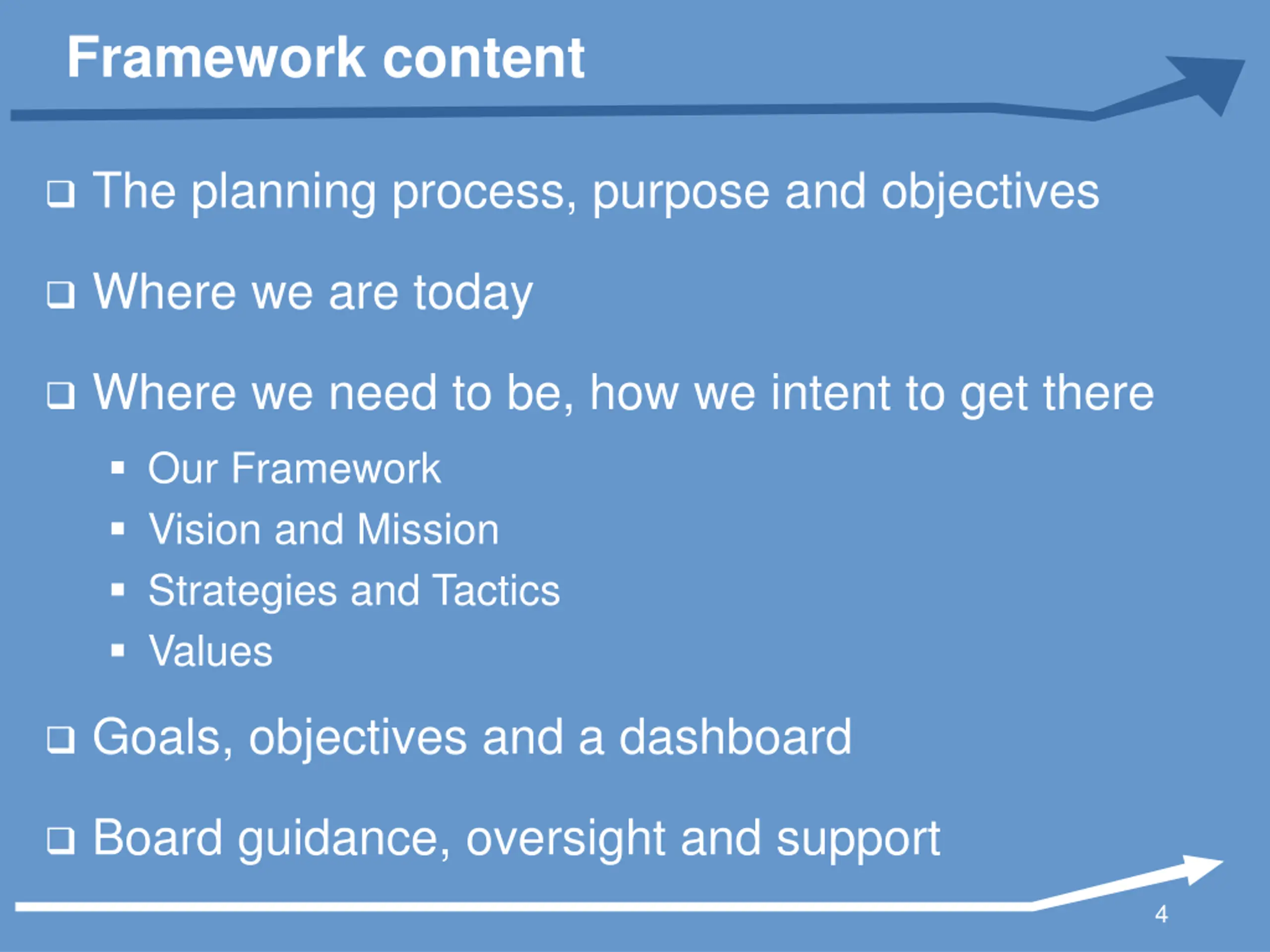 Framework content The planning process, purpose and objectives Where we are today Where we need to be, how we intent to get there Our Framework Vision and Mission Strategies and Tactics Values Goals, objectives and a dashboard Board guidance, oversight and support 5