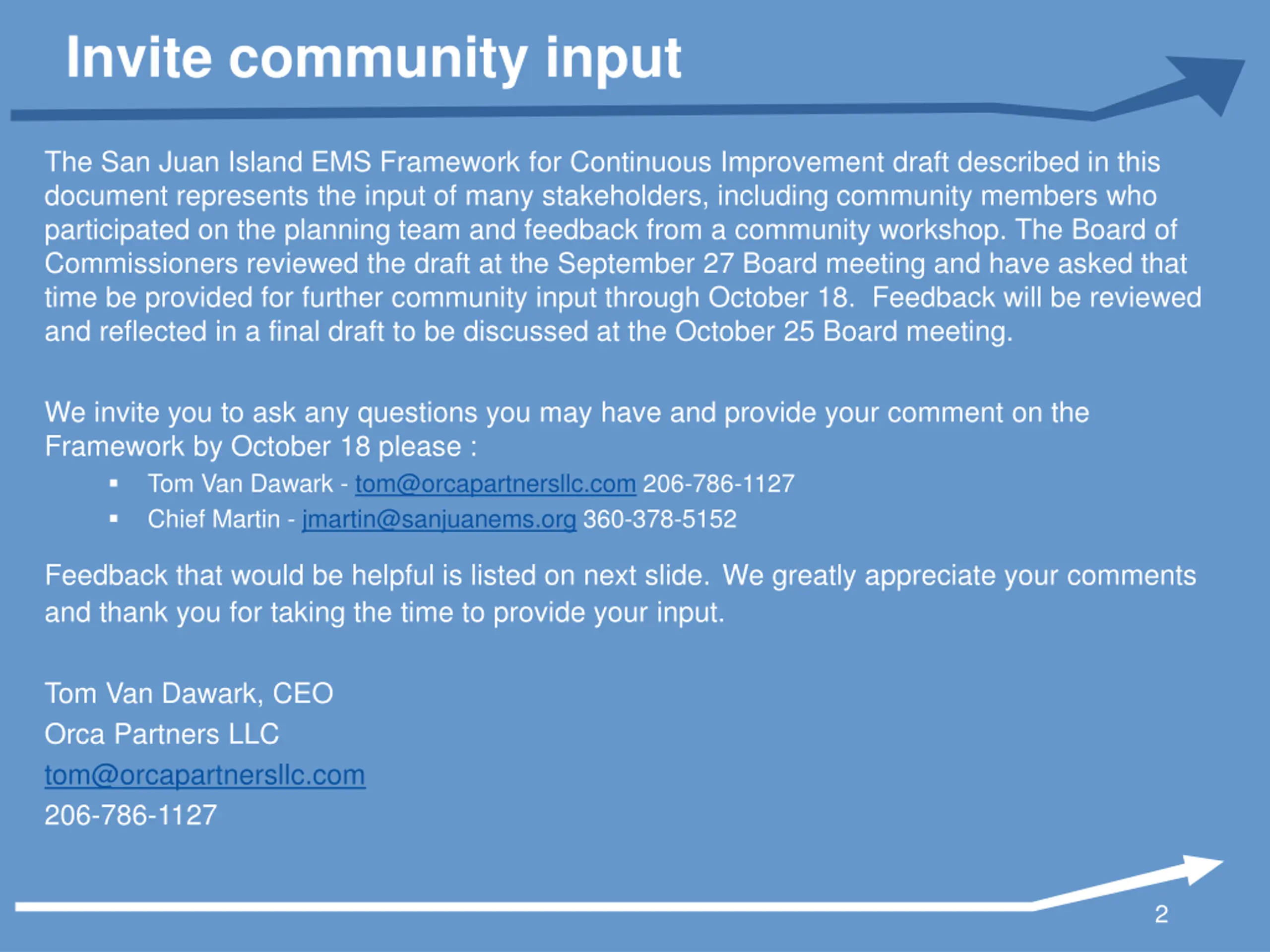 Invite community input The San Juan Island EMS Framework for Continuous Improvement draft described in this document represents the input of many stakeholders, including community members who participated on the planning team and feedback from a community workshop. The Board of Commissioners reviewed the draft at the September 27 Board meeting and have asked that time be provided for further community input through October 18. Feedback will be reviewed and reflected in a final draft to be discussed at the October 25 Board meeting. We invite you to ask any questions you may have and provide your comment on the Framework by October 18 please : Tom Van Dawark - tom@orcapartnersllc.com 206-786-1127 Chief Martin - jmartin@sanjuanems.org 360-378-5152 Feedback that would be helpful is listed on next slide.We greatly appreciate your comments and thank you for taking the time to provide your input. Tom Van Dawark, CEO Orca Partners LLC tom@orcapartnersllc.com 206-786-1127 2