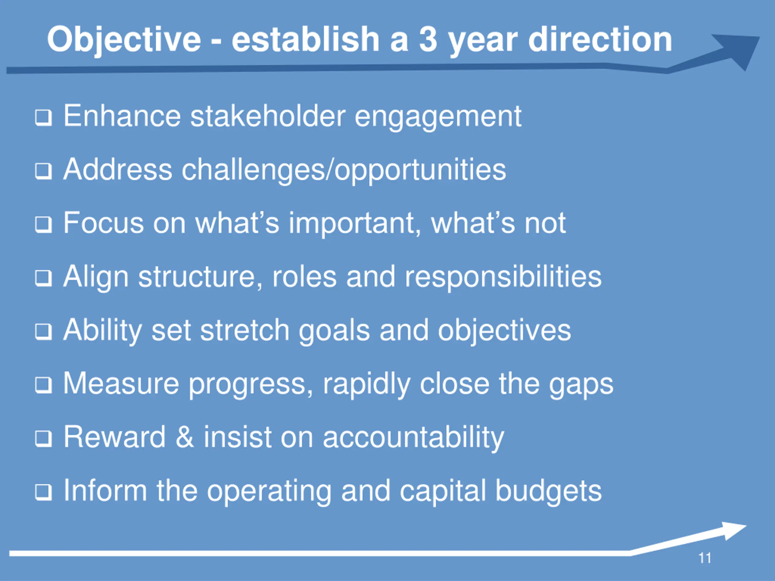 Objective - establish a 3 year direction Enhance stakeholder engagement Address challenges/opportunities Focus on what s important, what s not Align structure, roles and responsibilities Ability set stretch goals and objectives Measure progress, rapidly close the gaps Reward & insist on accountability Inform the operating and capital budgets 11