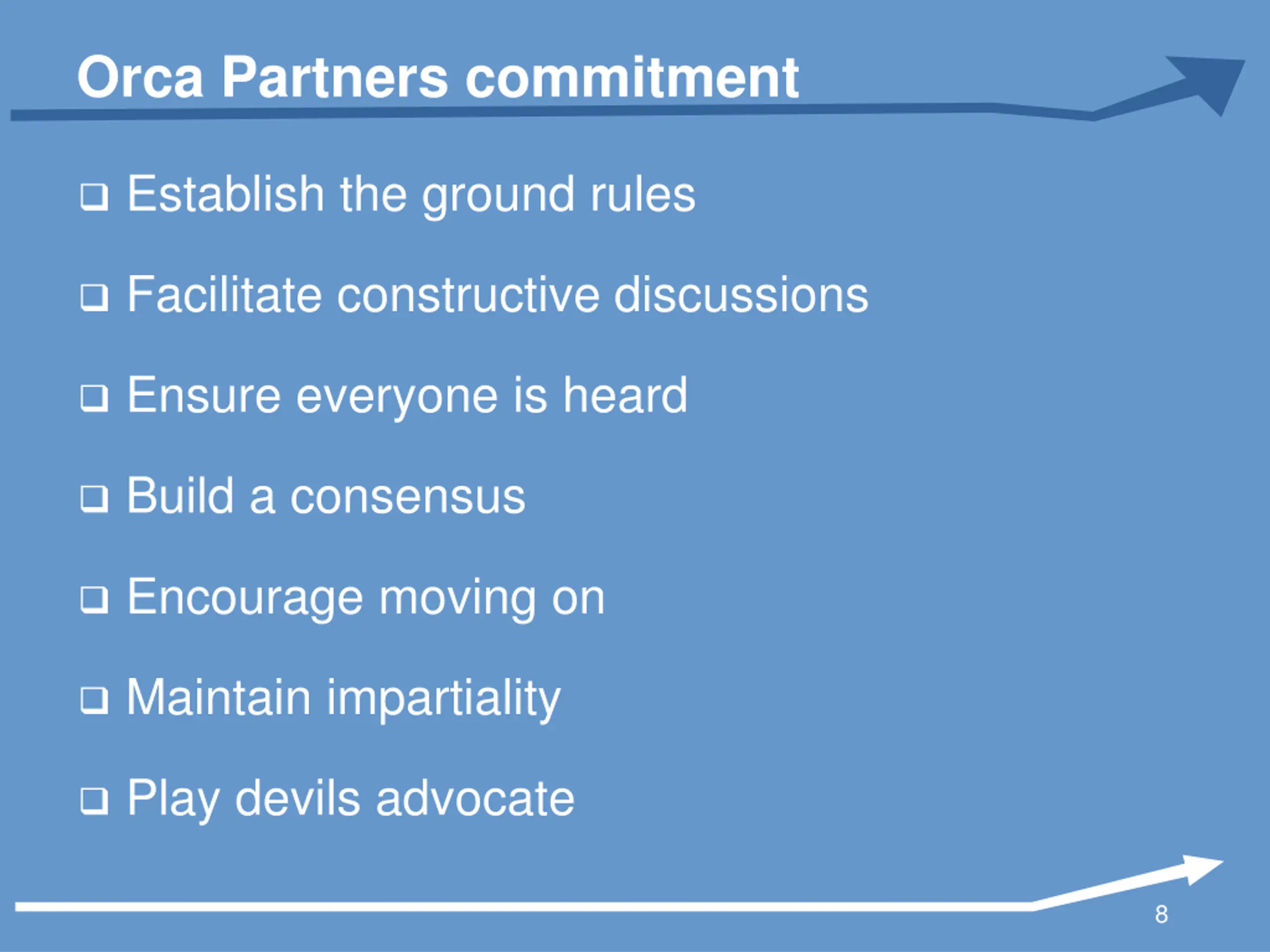 Orca Partners commitment Establish the ground rules Facilitate constructive discussions Ensure everyone is heard Build a consensus Encourage moving on Maintain impartiality Play devils advocate 8