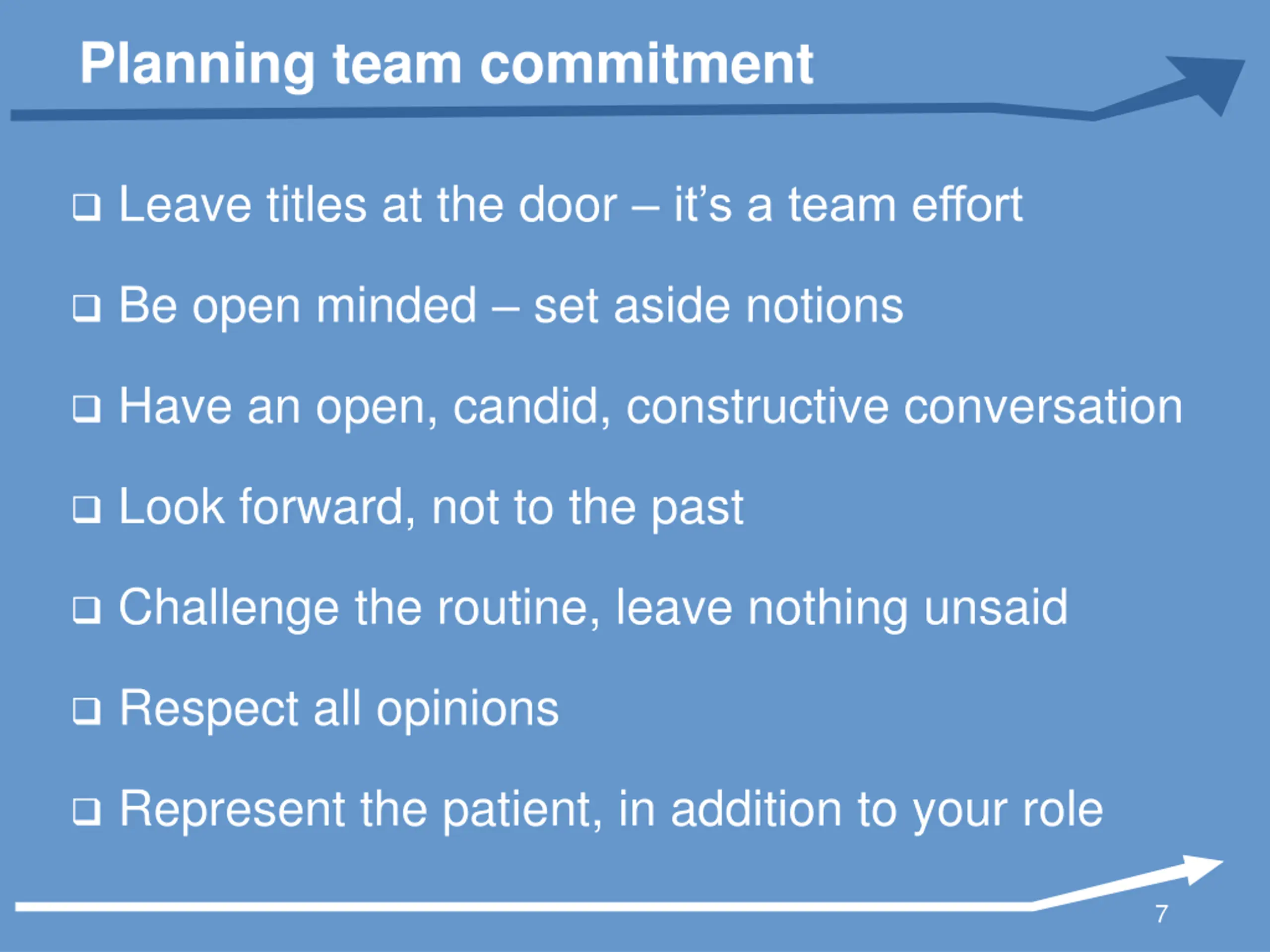 Planning team commitment Leave titles at the door it s a team effort Be open minded set aside notions Have an open, candid, constructive conversation Look forward, not to the past Challenge the routine, leave nothing unsaid Respect all opinions Represent the patient, in addition to your role 7