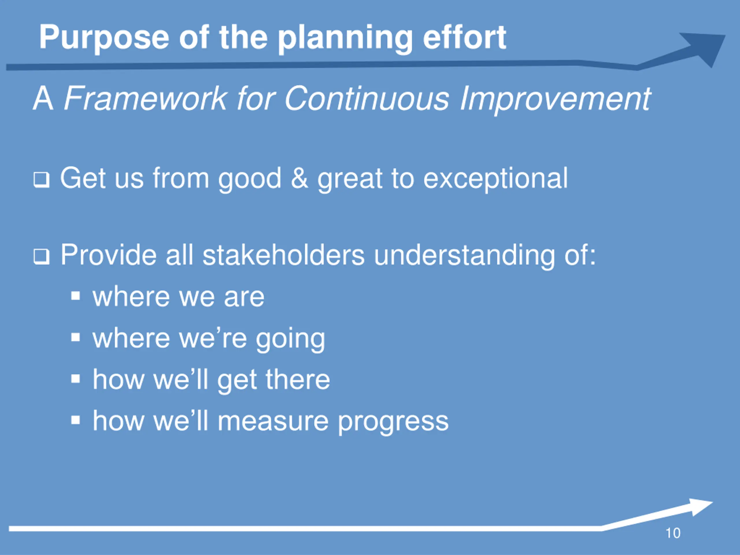 Purpose of the planning effort A Framework for Continuous Improvement Get us from good & great to exceptional Provide all stakeholders understanding of: where we are where we re going how we ll get there how we ll measure progress 10