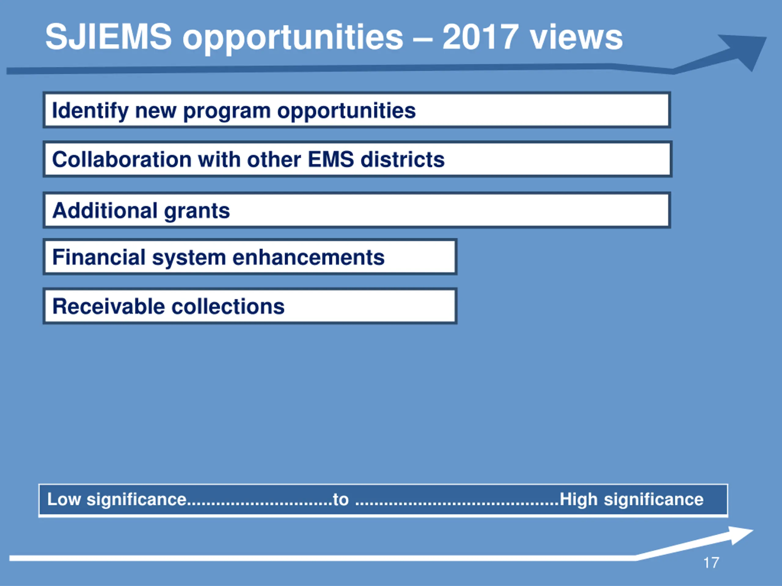 SJIEMS opportunities 2017 views Identify new program opportunities Collaboration with other EMS districts Additional grants Financial system enhancements Receivable collections Low significance..............................to ..........................................High significance 17