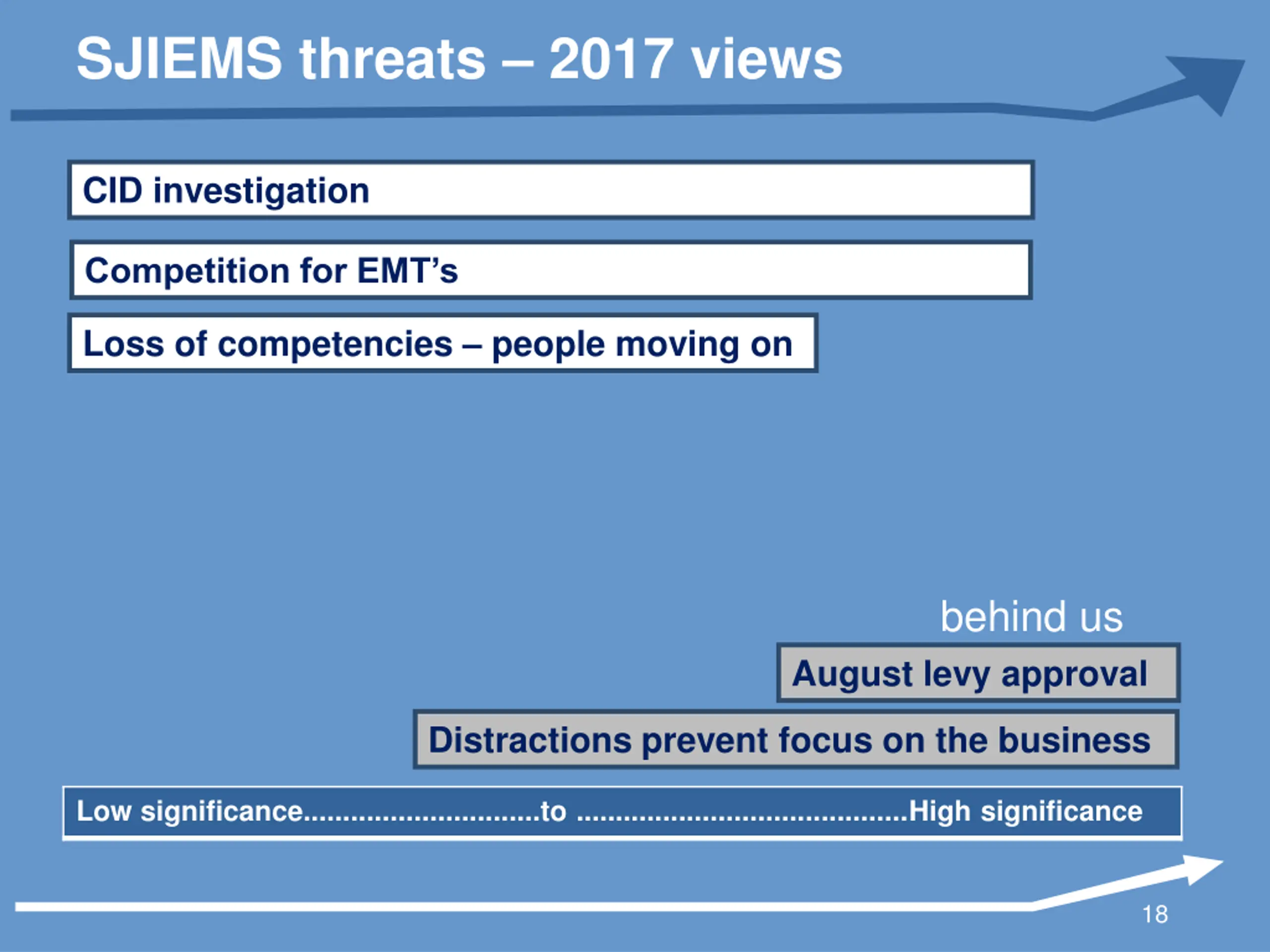 SJIEMS threats 2017 views CID investigation Competition for EMT s Loss of competencies people moving on behind us August levy approval Distractions prevent focus on the business Low significance..............................to ..........................................High significance 18