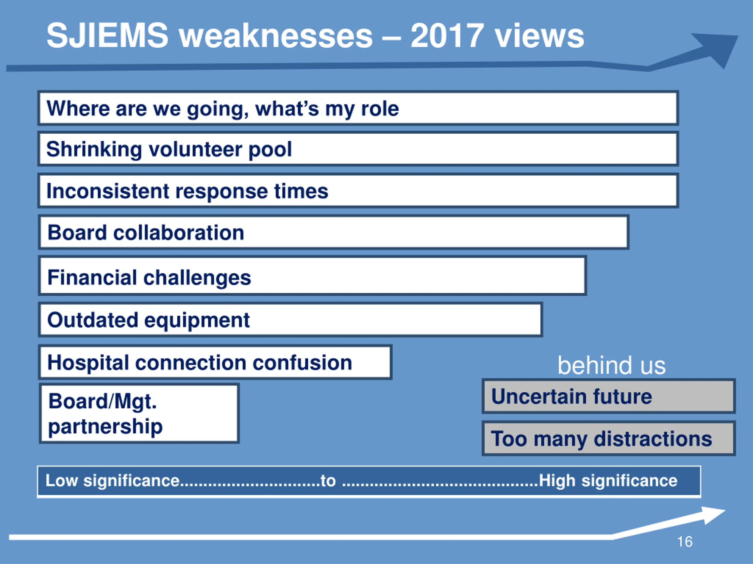 SJIEMS weaknesses 2017 views Where are we going, what s my role Shrinking volunteer pool Inconsistent response times Board collaboration Financial challenges Outdated equipment Hospital connection confusion behind us Uncertain future Board/Mgt. partnership Too many distractions Low significance..............................to ..........................................High significance 16