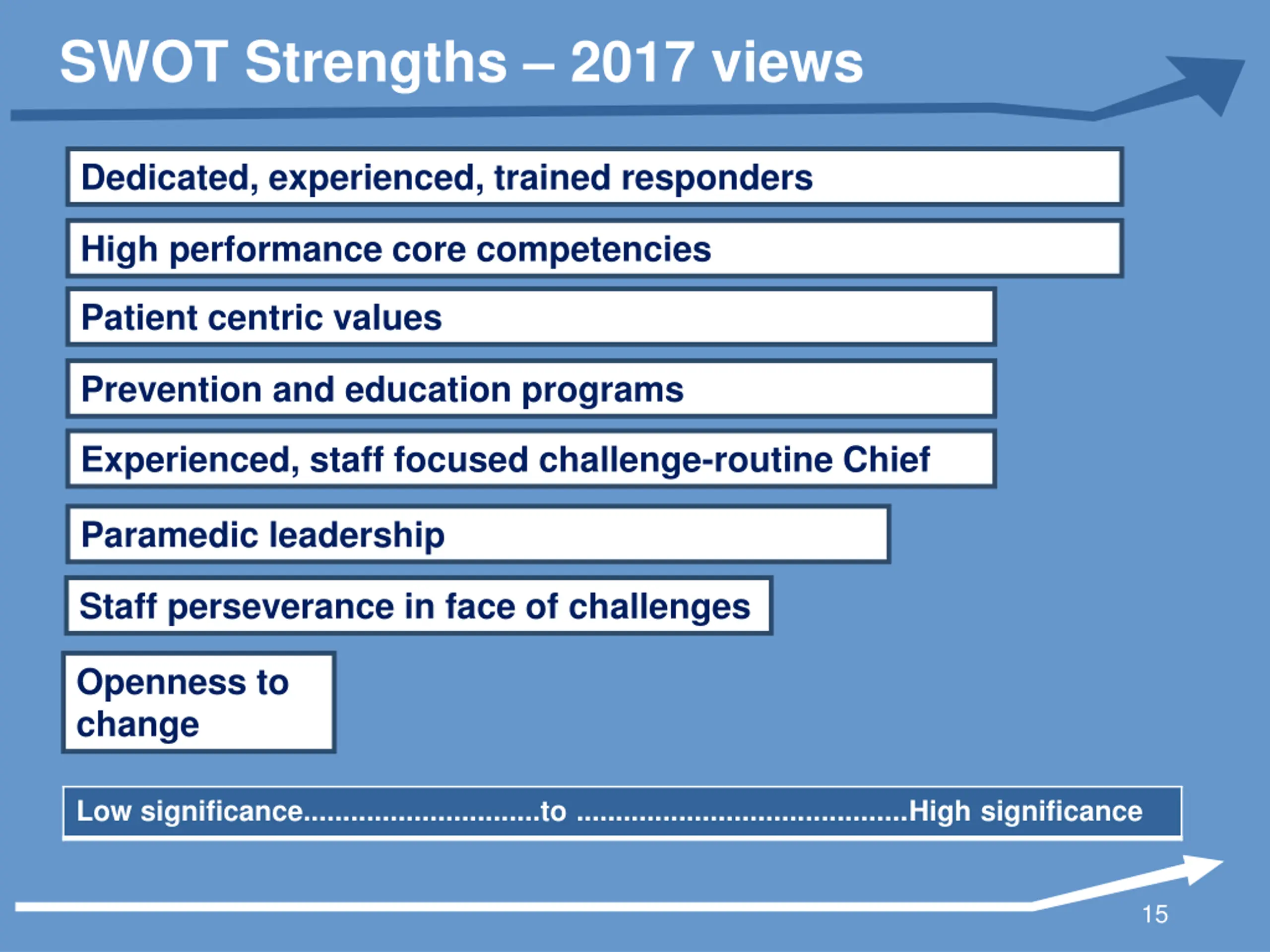 SWOT Strengths 2017 views Dedicated, experienced, trained responders High performance core competencies Patient centric values Prevention and education programs Experienced, staff focused challenge-routine Chief Paramedic leadership Staff perseverance in face of challenges Openness to change Low significance..............................to ..........................................High significance 15