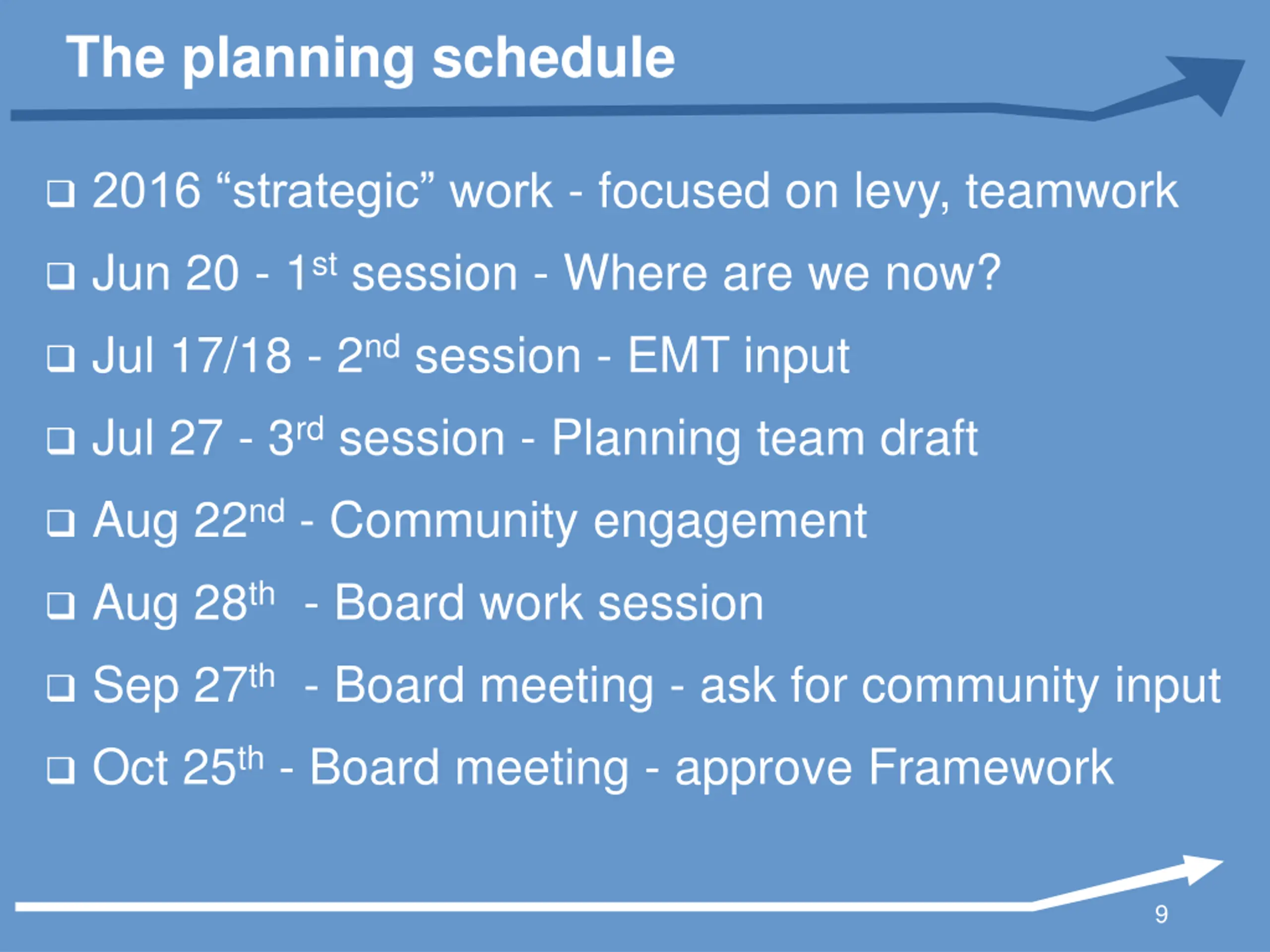 The planning schedule 2016 strategic work - focused on levy, teamwork Jun 20 - 1st session - Where are we now? Jul 17/18 - 2nd session - EMT input Jul 27 - 3rd session - Planning team draft Aug 22nd - Community engagement Aug 28th - Board work session Sep 27th - Board meeting - ask for community input Oct 25th - Board meeting - approve Framework 9