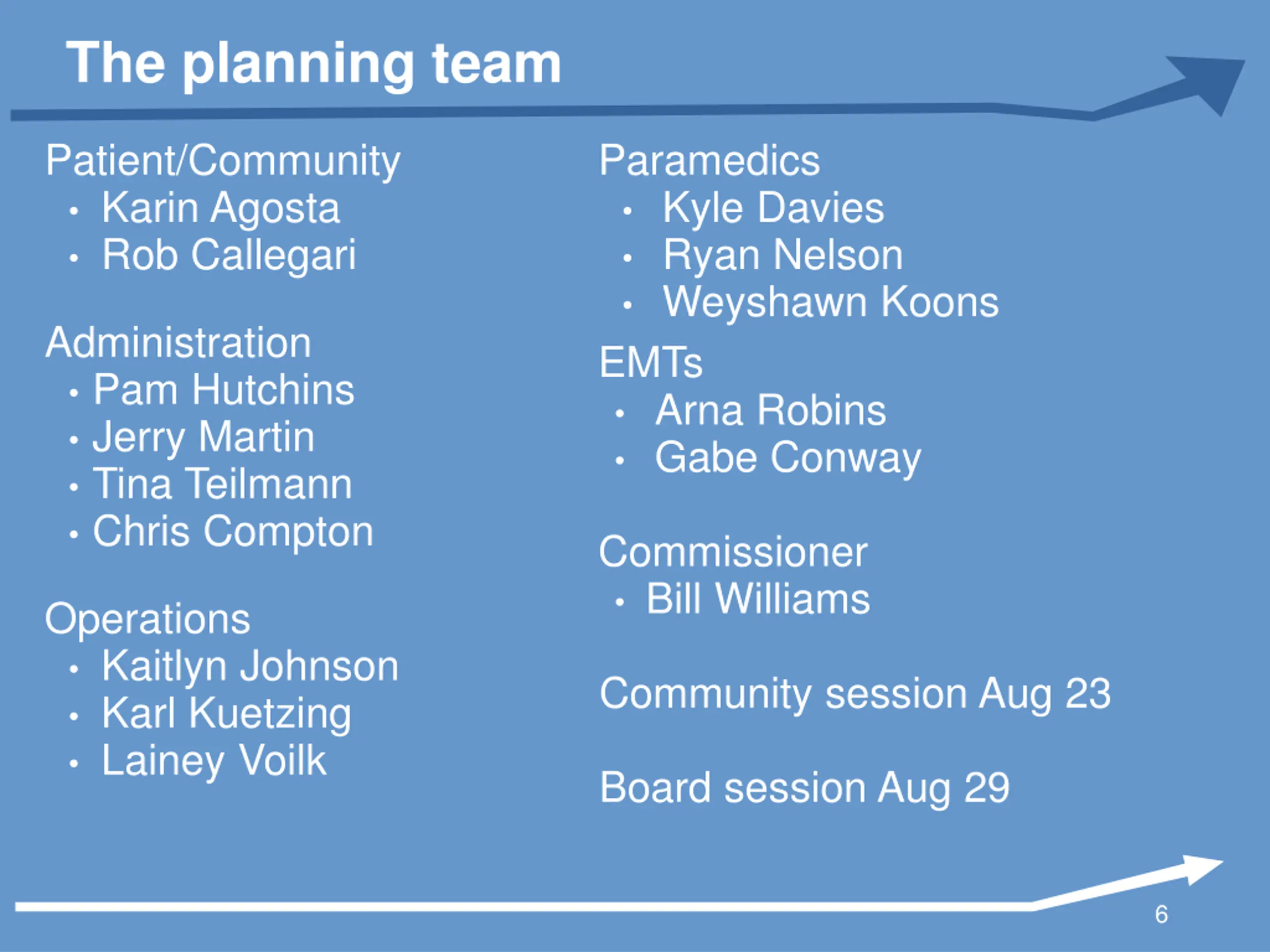 The planning team Patient/Community Karin Agosta Rob Callegari Paramedics Kyle Davies Ryan Nelson Weyshawn Koons EMTs Arna Robins Gabe Conway Administration Pam Hutchins Jerry Martin Tina Teilmann Chris Compton Commissioner Bill Williams Operations Kaitlyn Johnson Karl Kuetzing Lainey Voilk Community session Aug 23 Board session Aug 29 6