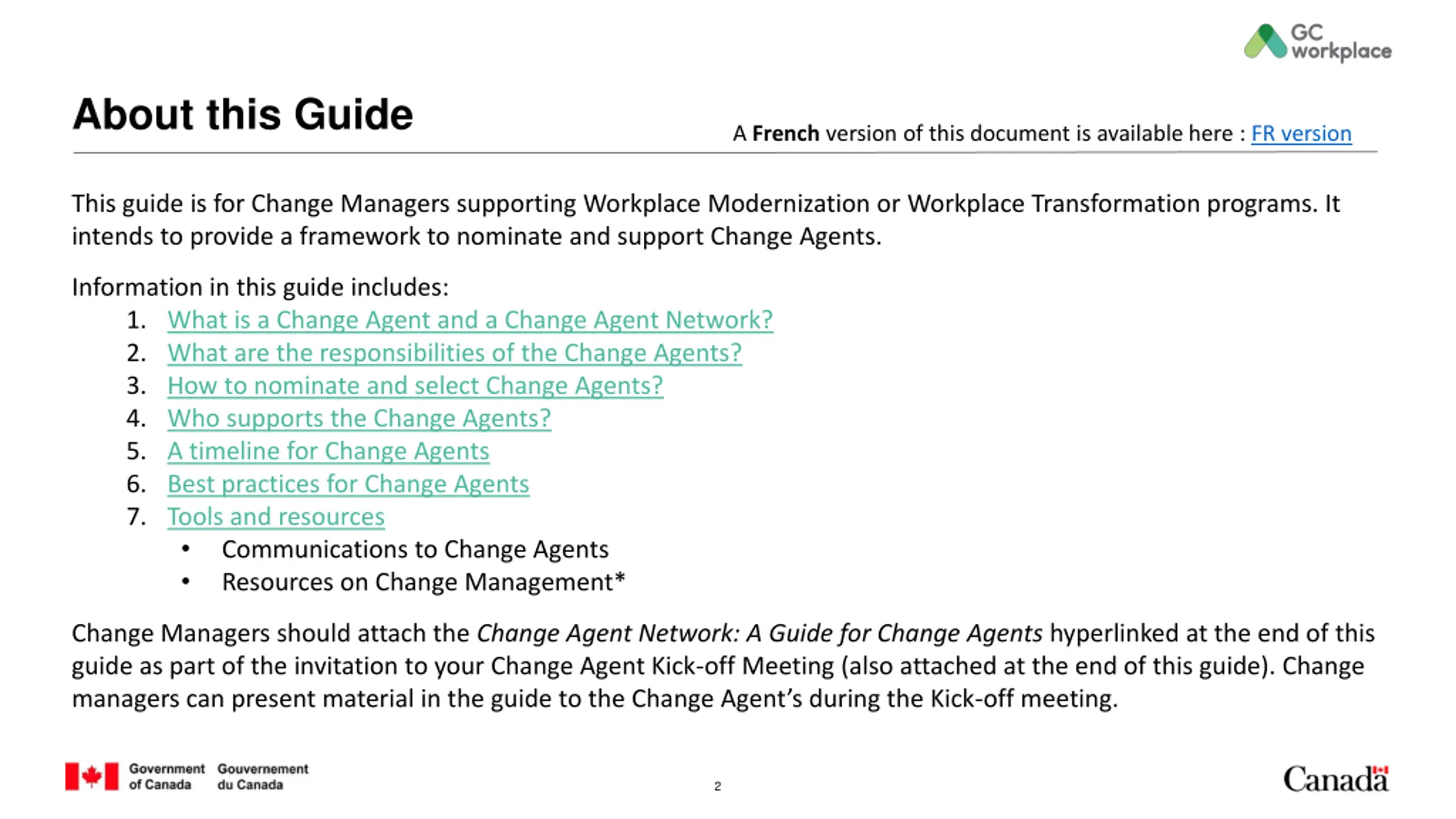 About this Guide A French version of this document is available here : FR version This guide is for Change Managers supporting Workplace Modernization or Workplace Transformation programs. It intends to provide a framework to nominate and support Change Agents. Information in this guide includes: 1. What is a Change Agent and a Change Agent Network? 2. What are the responsibilities of the Change Agents? 3. How to nominate and select Change Agents? 4. Who supports the Change Agents? 5. A timeline for Change Agents 6. Best practices for Change Agents 7. Tools and resources Communications to Change Agents Resources on Change Management* Change Managers should attach the Change Agent Network: A Guide for Change Agents hyperlinked at the end of this guide as part of the invitation to your Change Agent Kick-off Meeting (also attached at the end of this guide). Change managers can present material in the guide to the Change Agent s during the Kick-off meeting. Image result for canada wordmark 2