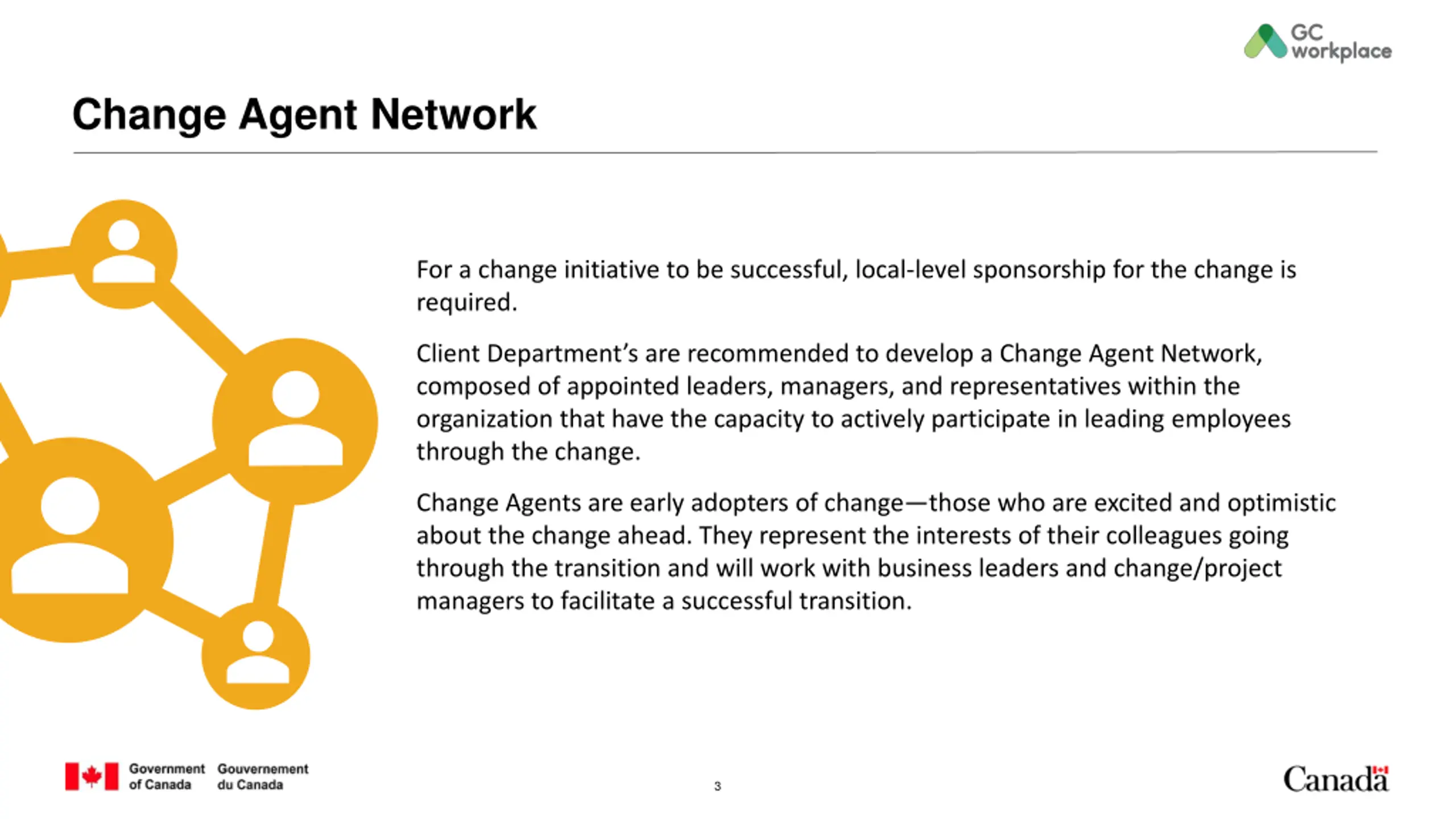 Change Agent Network For a change initiative to be successful, local-level sponsorship for the change is required. Client Department s are recommended to develop a Change Agent Network, composed of appointed leaders, managers, and representatives within the organization that have the capacity to actively participate in leading employees through the change. Change Agents are early adopters of change those who are excited and optimistic about the change ahead. They represent the interests of their colleagues going through the transition and will work with business leaders and change/project managers to facilitate a successful transition. Image result for canada wordmark 3