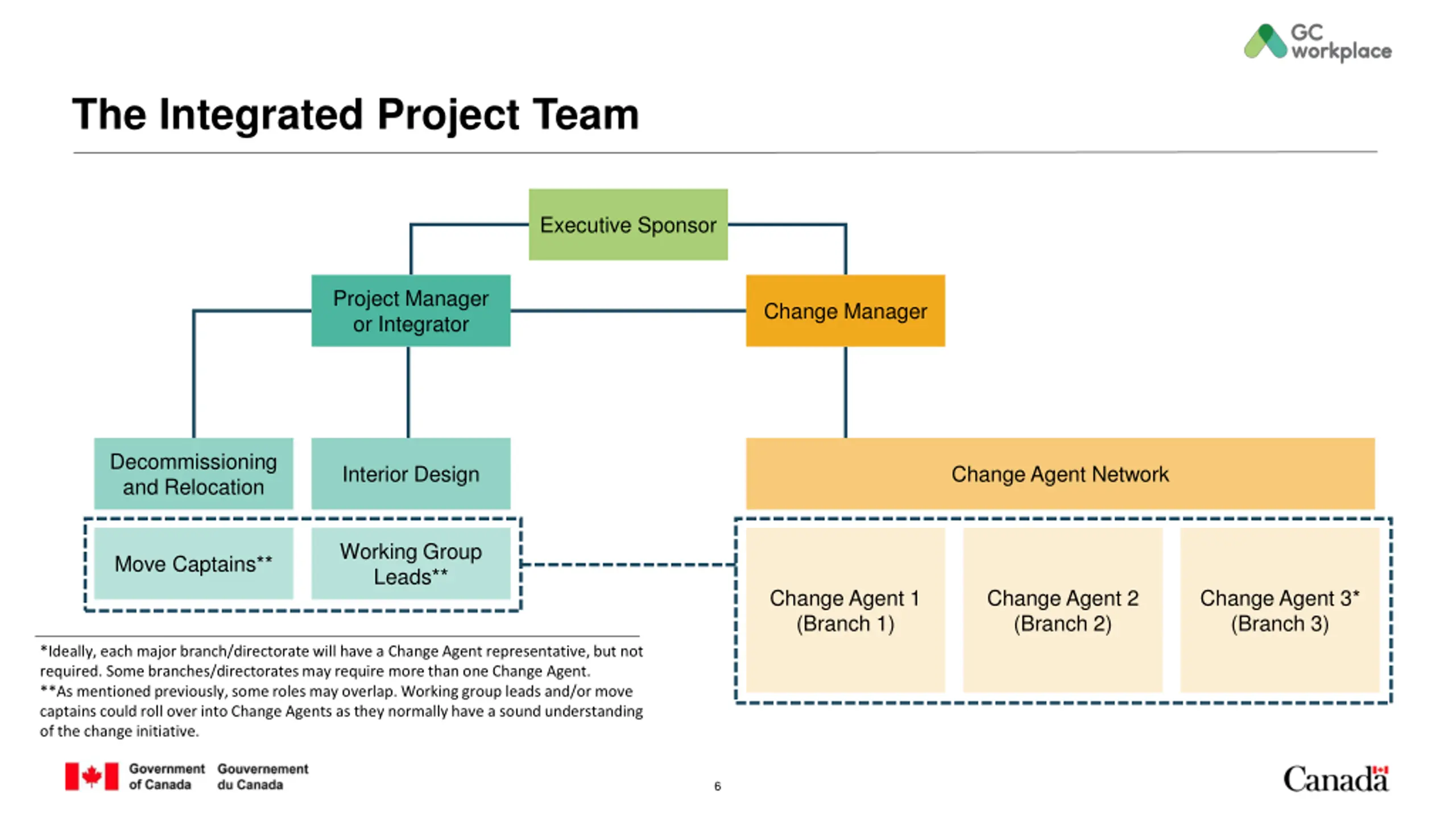 The Integrated Project Team Executive Sponsor Project Manager or Integrator Change Manager Decommissioning and Relocation Interior Design Change Agent Network Working Group Leads** Move Captains** Change Agent 1 (Branch 1) Change Agent 2 (Branch 2) Change Agent 3* (Branch 3) *Ideally, each major branch/directorate will have a Change Agent representative, but not required. Some branches/directorates may require more than one Change Agent. **As mentioned previously, some roles may overlap. Working group leads and/or move captains could roll over into Change Agents as they normally have a sound understanding of the change initiative. Image result for canada wordmark 6