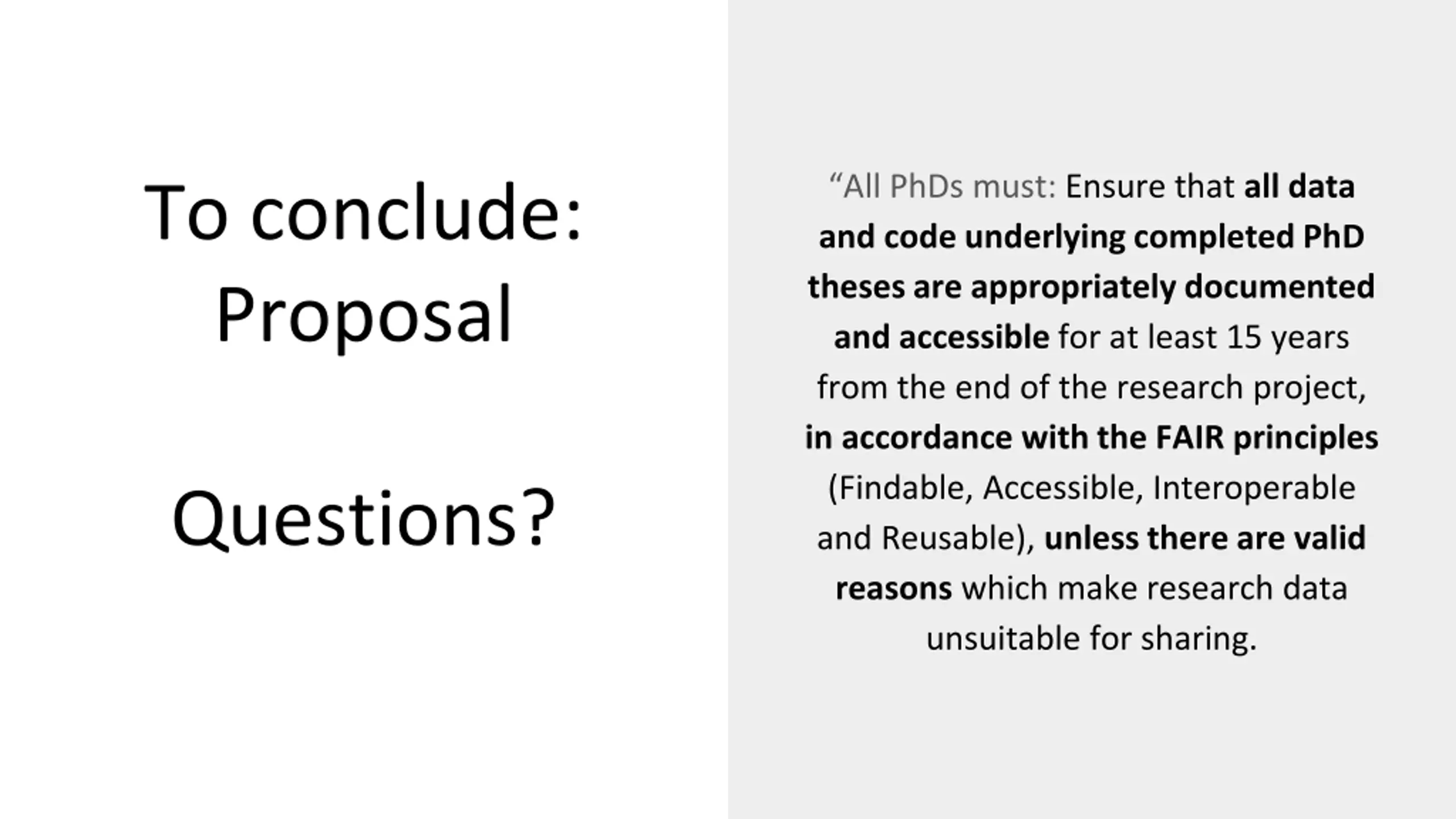 All PhDs must: Ensure that all data and code underlying completed PhD theses are appropriately documented and accessible for at least 15 years from the end of the research project, in accordance with the FAIR principles (Findable, Accessible, Interoperable and Reusable), unless there are valid reasons which make research data unsuitable for sharing. To conclude: Proposal Questions?