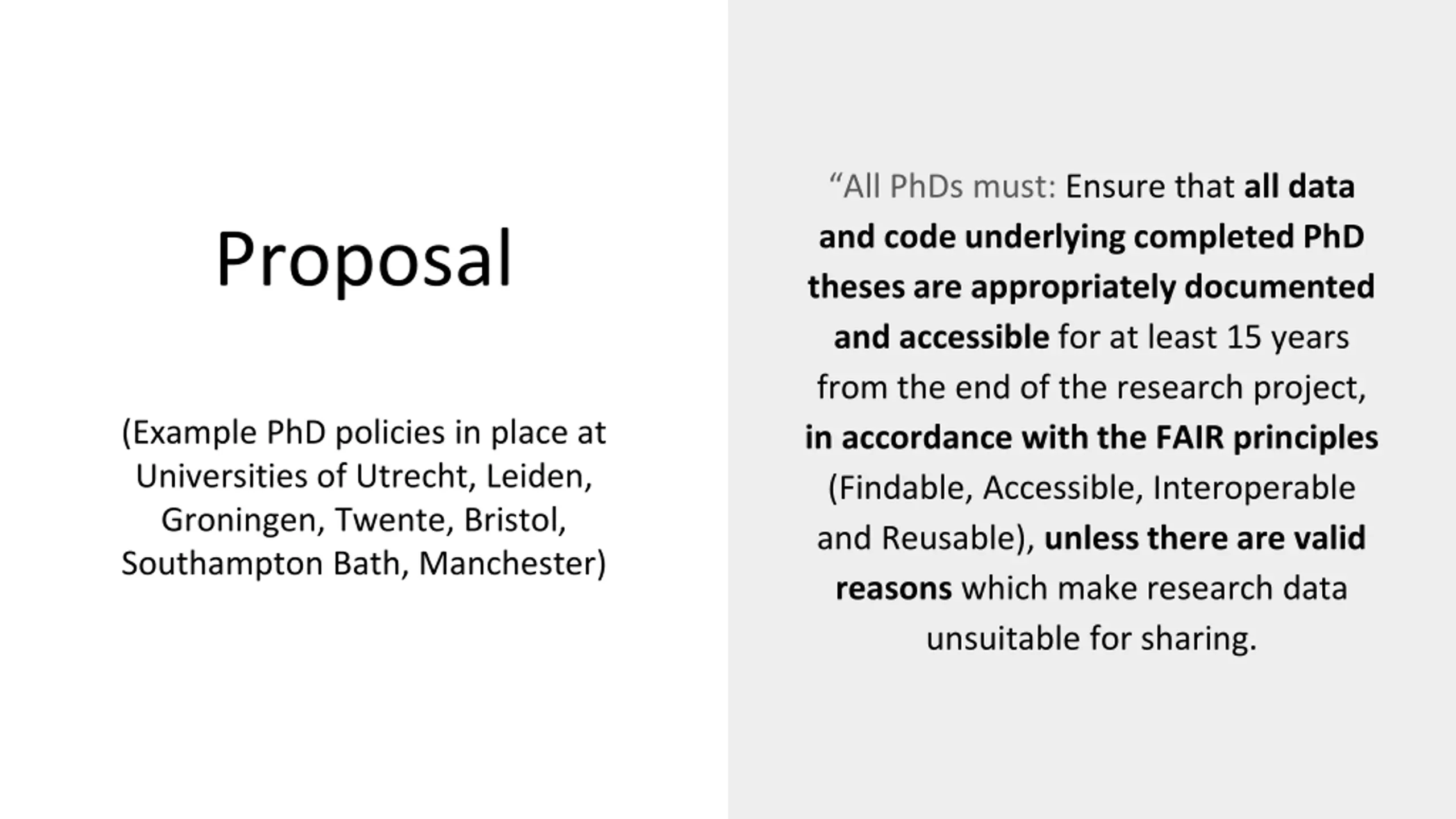 All PhDs must: Ensure that all data and code underlying completed PhD theses are appropriately documented and accessible for at least 15 years from the end of the research project, in accordance with the FAIR principles (Findable, Accessible, Interoperable and Reusable), unless there are valid reasons which make research data unsuitable for sharing. Proposal (Example PhD policies in place at Universities of Utrecht, Leiden, Groningen, Twente, Bristol, Southampton Bath, Manchester)