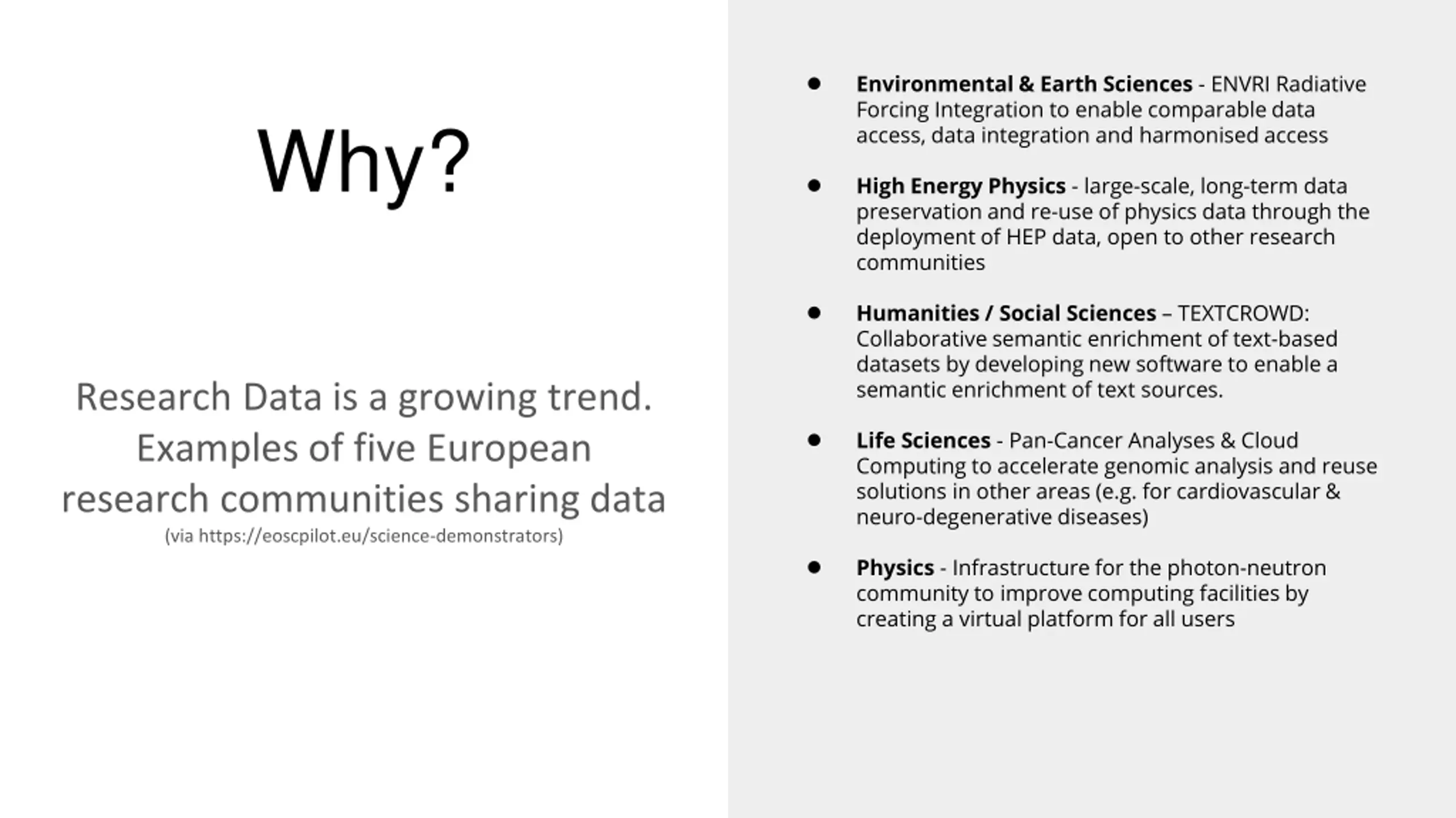 Environmental & Earth Sciences - ENVRI Radiative Forcing Integration to enable comparable data access, data integration and harmonised access Why? High Energy Physics - large-scale, long-term data preservation and re-use of physics data through the deployment of HEP data, open to other research communities Humanities / Social Sciences TEXTCROWD: Collaborative semantic enrichment of text-based datasets by developing new software to enable a semantic enrichment of text sources. Research Data is a growing trend. Examples of five European research communities sharing data (via https://eoscpilot.eu/science-demonstrators) Life Sciences - Pan-Cancer Analyses & Cloud Computing to accelerate genomic analysis and reuse solutions in other areas (e.g. for cardiovascular & neuro-degenerative diseases) Physics - Infrastructure for the photon-neutron community to improve computing facilities by creating a virtual platform for all users