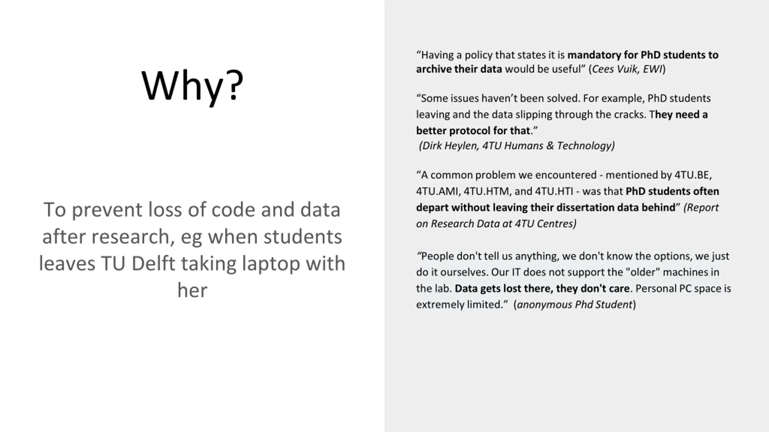 Having a policy that states it is mandatory for PhD students to archive their data would be useful (Cees Vuik, EWI) Why? Some issues haven t been solved. For example, PhD students leaving and the data slipping through the cracks. They need a better protocol for that. (Dirk Heylen, 4TU Humans & Technology) A common problem we encountered - mentioned by 4TU.BE, 4TU.AMI, 4TU.HTM, and 4TU.HTI - was that PhD students often depart without leaving their dissertation data behind (Report on Research Data at 4TU Centres) To prevent loss of code and data after research, eg when students leaves TU Delft taking laptop with her People don't tell us anything, we don't know the options, we just do it ourselves. Our IT does not support the "older" machines in the lab. Data gets lost there, they don't care. Personal PC space is extremely limited. (anonymous Phd Student)