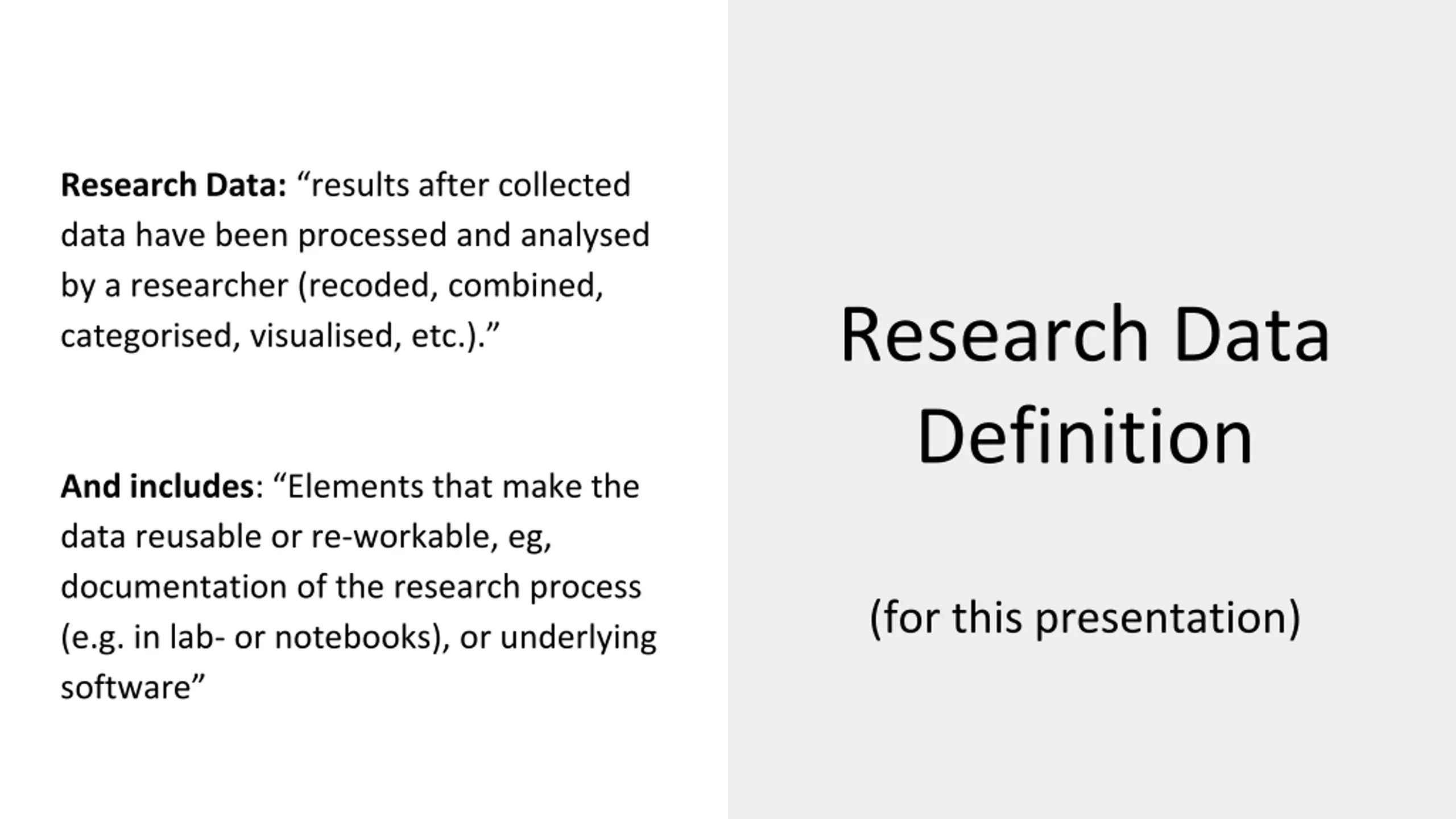 Research Data: results after collected data have been processed and analysed by a researcher (recoded, combined, categorised, visualised, etc.). Research Data Definition And includes: Elements that make the data reusable or re-workable, eg, documentation of the research process (e.g. in lab- or notebooks), or underlying software (for this presentation)
