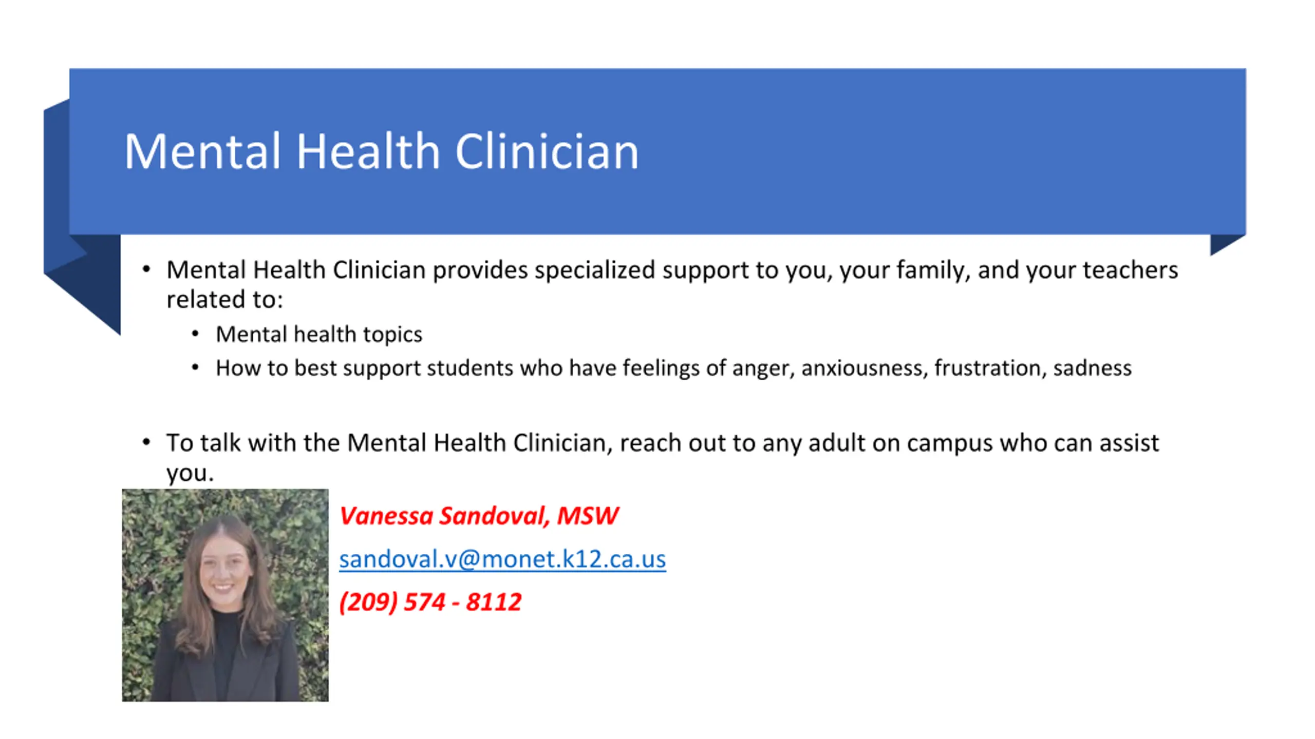 Mental Health Clinician Mental Health Clinician provides specialized support to you, your family, and your teachers related to: Mental health topics How to best support students who have feelings of anger, anxiousness, frustration, sadness To talk with the Mental Health Clinician, reach out to any adult on campus who can assist you. Vanessa Sandoval, MSW sandoval.v@monet.k12.ca.us (209) 574 - 8112