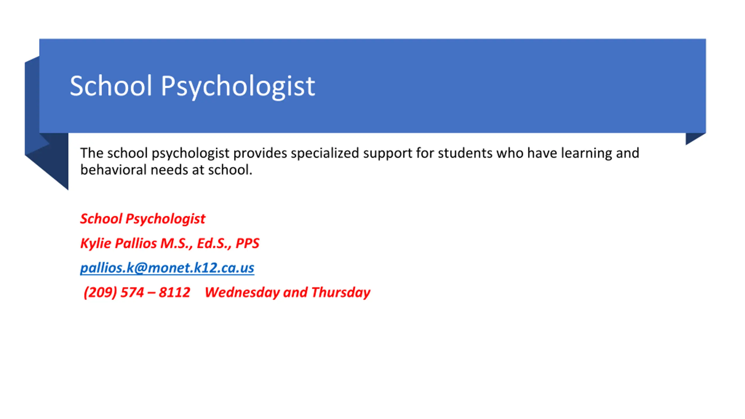 School Psychologist The school psychologist provides specialized support for students who have learning and behavioral needs at school. School Psychologist Kylie Pallios M.S., Ed.S., PPS pallios.k@monet.k12.ca.us (209) 574 8112 Wednesday and Thursday