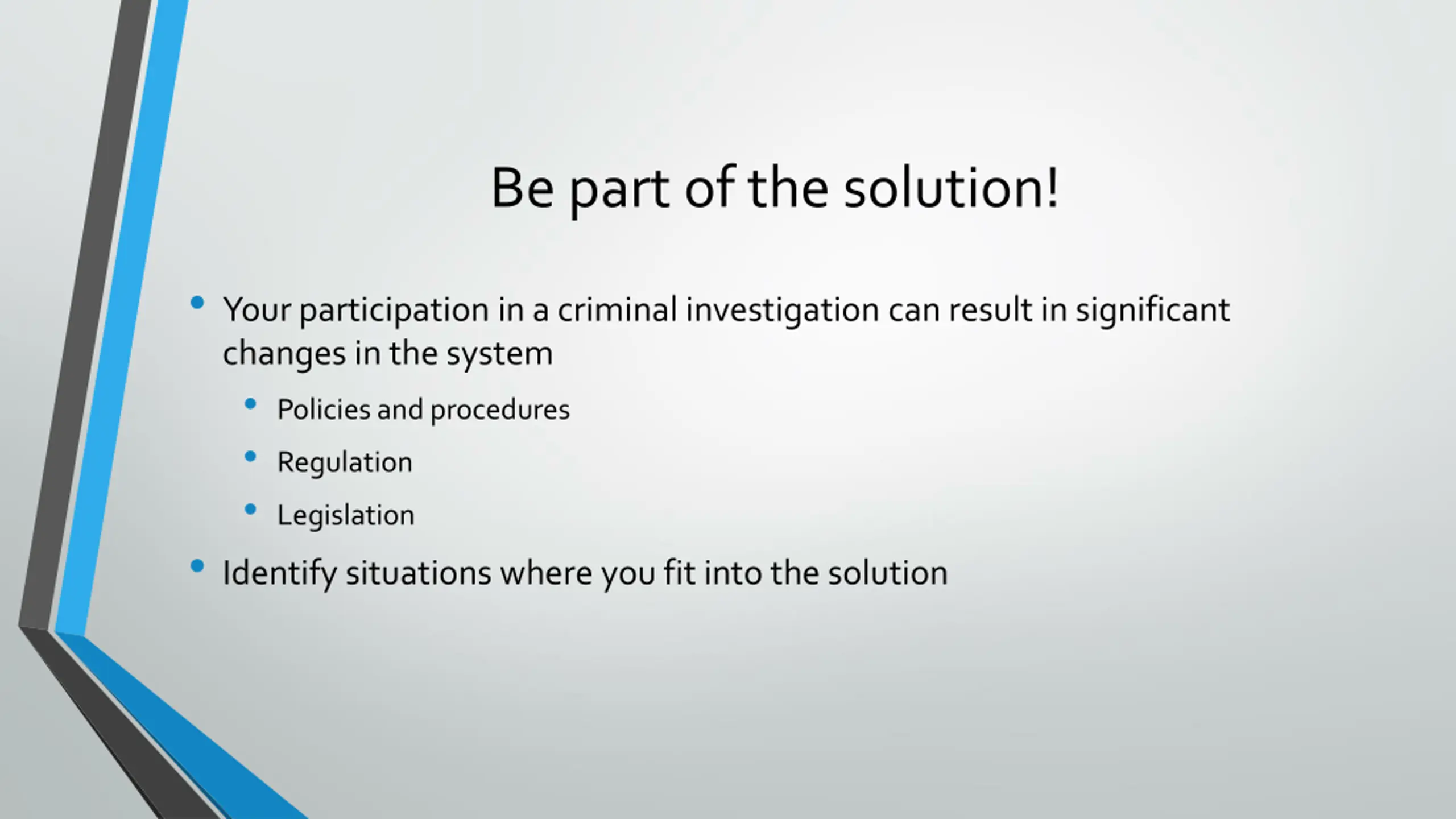 Be part of the solution! Your participation in a criminal investigation can result in significant changes in the system Policies and procedures Regulation Legislation Identify situations where you fit into the solution
