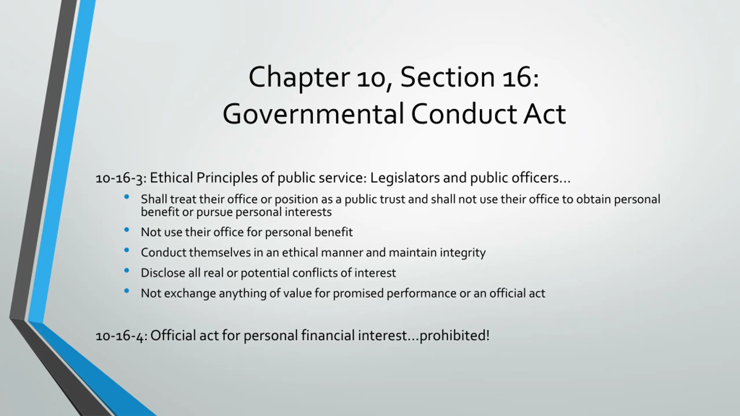 Chapter 10, Section 16: Governmental Conduct Act 10-16-3: Ethical Principles of public service: Legislators and public officers Shall treat their office or position as a public trust and shall not use their office to obtain personal benefit or pursue personal interests Not use their office for personal benefit Conduct themselves in an ethical manner and maintain integrity Disclose all real or potential conflicts of interest Not exchange anything of value for promised performance or an official act 10-16-4: Official act for personal financial interest prohibited!