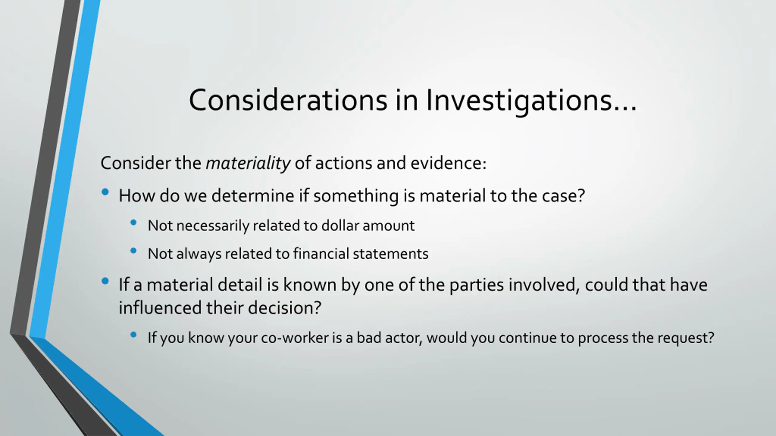 Considerations in Investigations Consider the materiality of actions and evidence: How do we determine if something is material to the case? Not necessarily related to dollar amount Not always related to financial statements If a material detail is known by one of the parties involved, could that have influenced their decision? If you know your co-worker is a bad actor, would you continue to process the request?