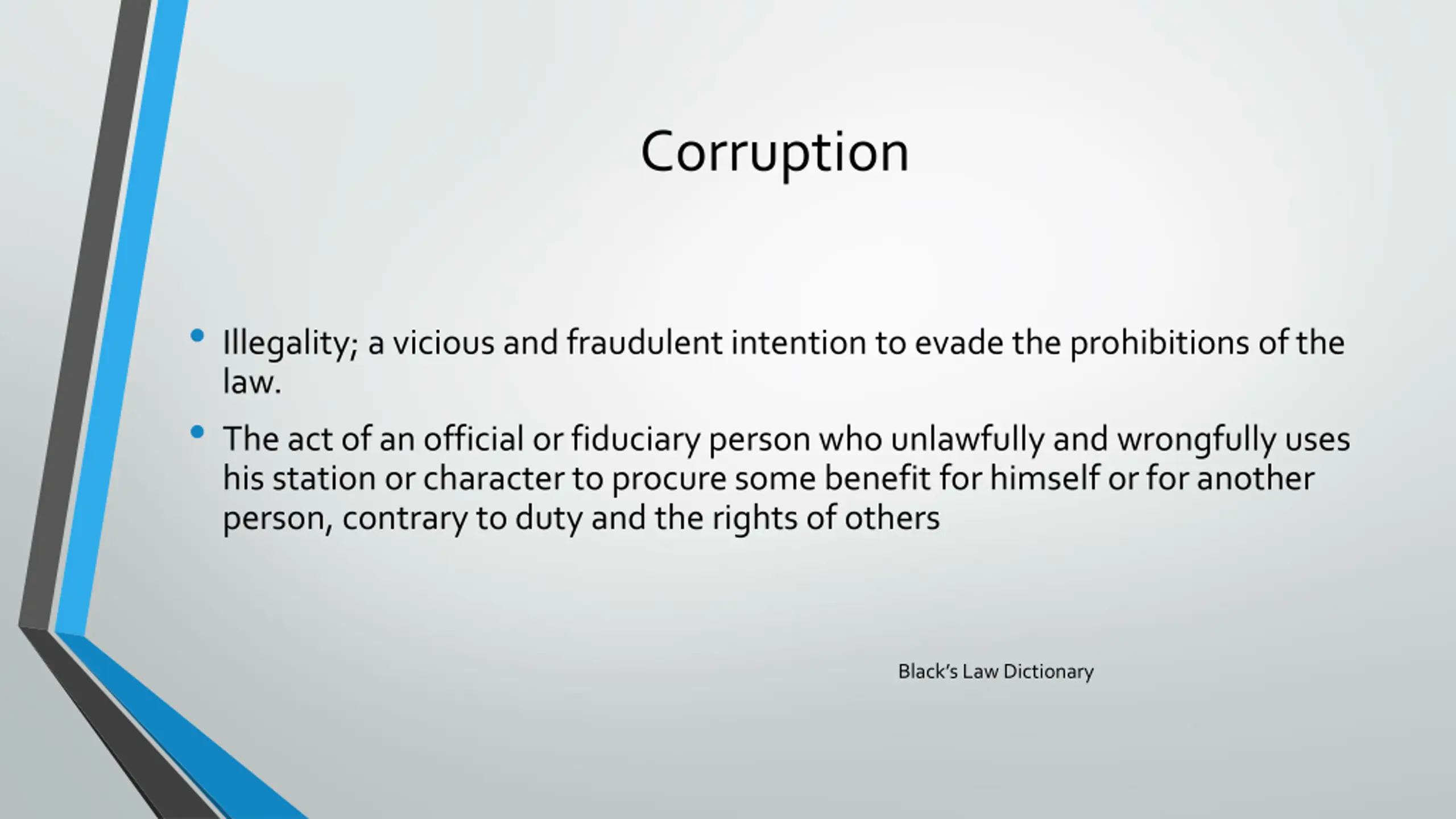 Corruption Illegality; a vicious and fraudulent intention to evade the prohibitions of the law. The act of an official or fiduciary person who unlawfully and wrongfully uses his station or character to procure some benefit for himself or for another person, contrary to duty and the rights of others Black s Law Dictionary