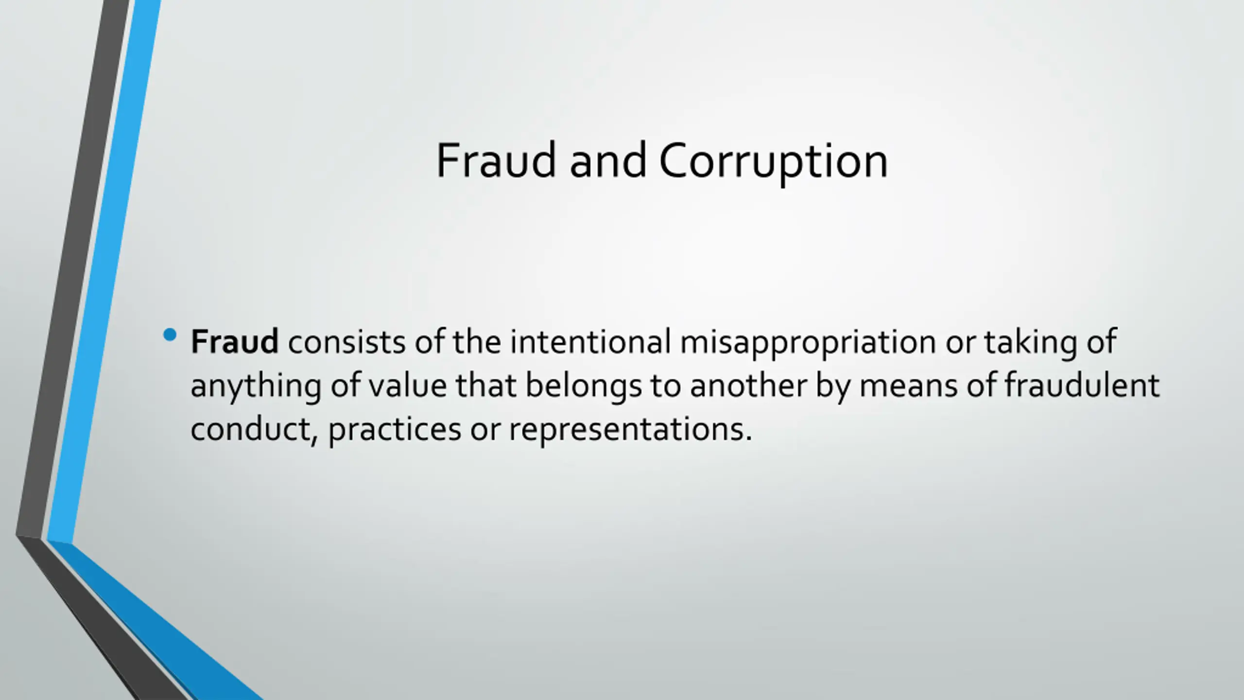 Fraud and Corruption Fraud consists of the intentional misappropriation or taking of anything of value that belongs to another by means of fraudulent conduct, practices or representations.