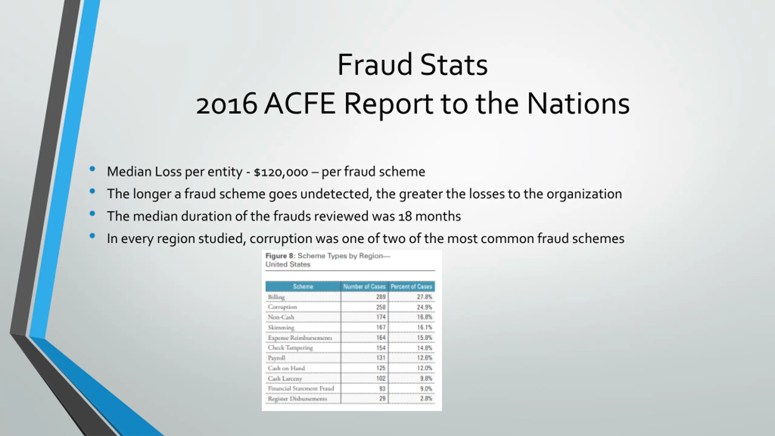 Fraud Stats 2016 ACFE Report to the Nations Median Loss per entity - $120,000 per fraud scheme The longer a fraud scheme goes undetected, the greater the losses to the organization The median duration of the frauds reviewed was 18 months In every region studied, corruption was one of two of the most common fraud schemes