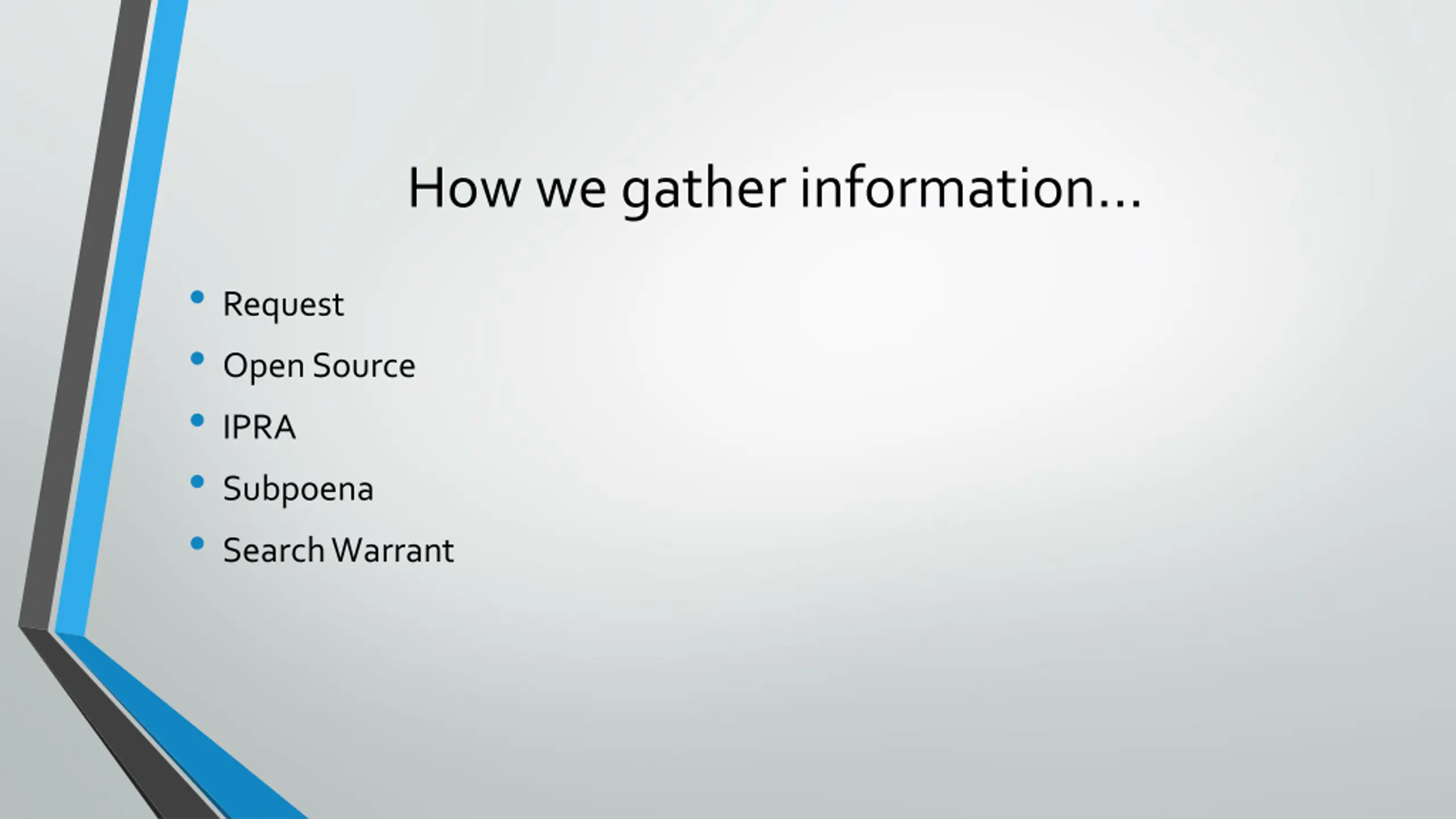 How we gather information Request Open Source IPRA Subpoena Search Warrant