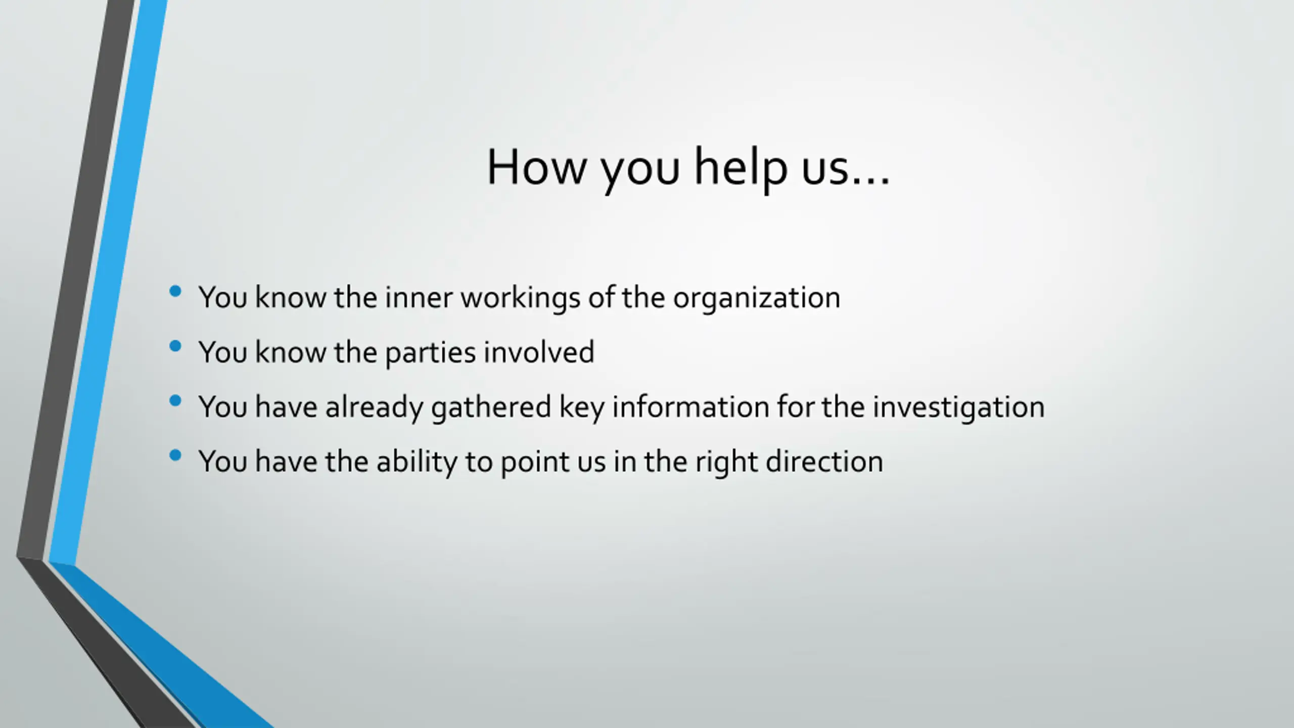 How you help us You know the inner workings of the organization You know the parties involved You have already gathered key information for the investigation You have the ability to point us in the right direction