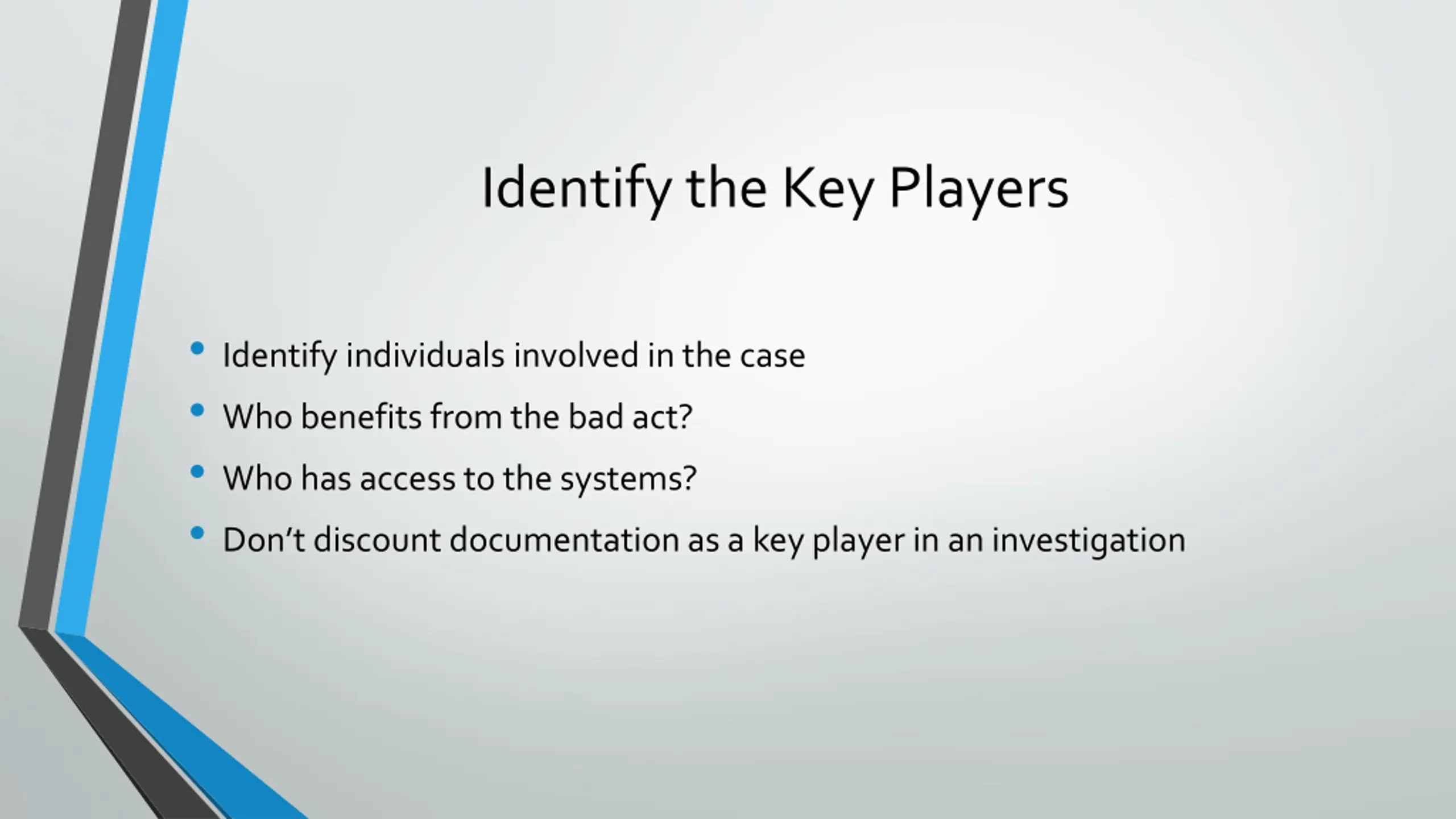 Identify the Key Players Identify individuals involved in the case Who benefits from the bad act? Who has access to the systems? Don t discount documentation as a key player in an investigation