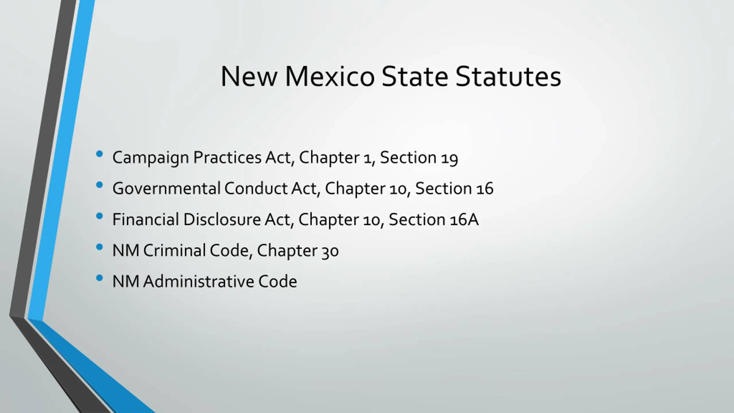 New Mexico State Statutes Campaign Practices Act, Chapter 1, Section 19 Governmental Conduct Act, Chapter 10, Section 16 Financial Disclosure Act, Chapter 10, Section 16A NM Criminal Code, Chapter 30 NM Administrative Code