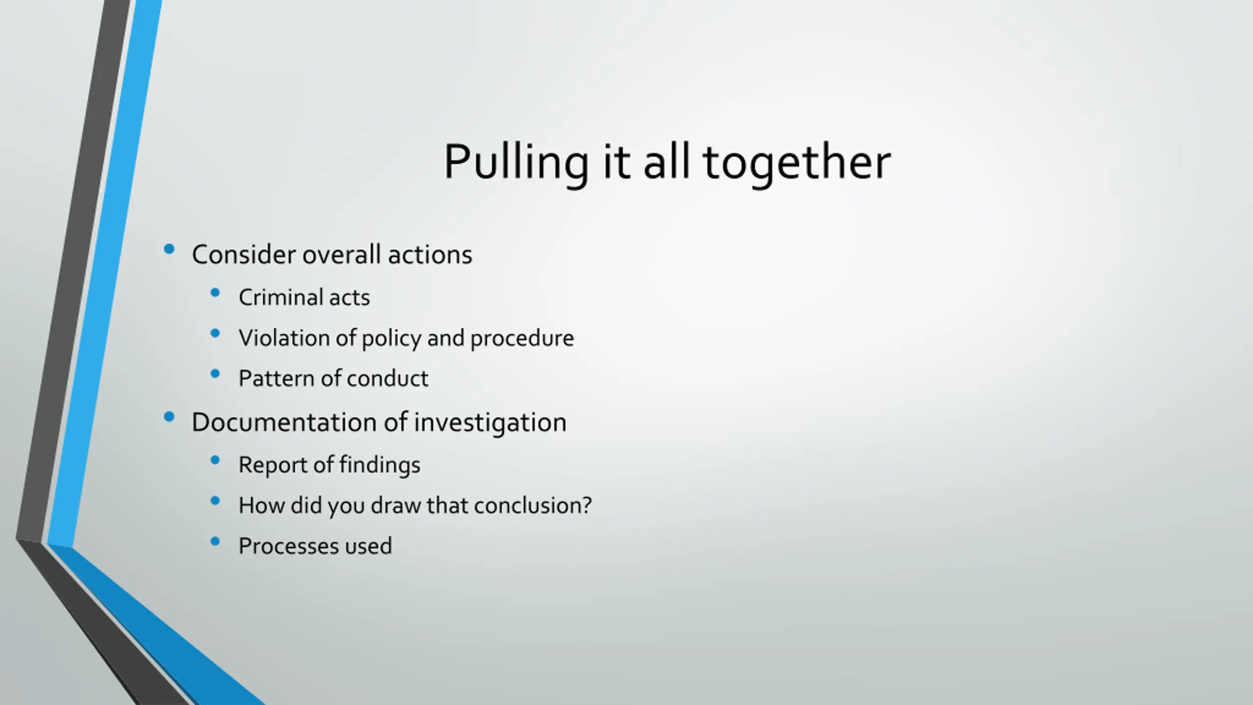 Pulling it all together Consider overall actions Criminal acts Violation of policy and procedure Pattern of conduct Documentation of investigation Report of findings How did you draw that conclusion? Processes used