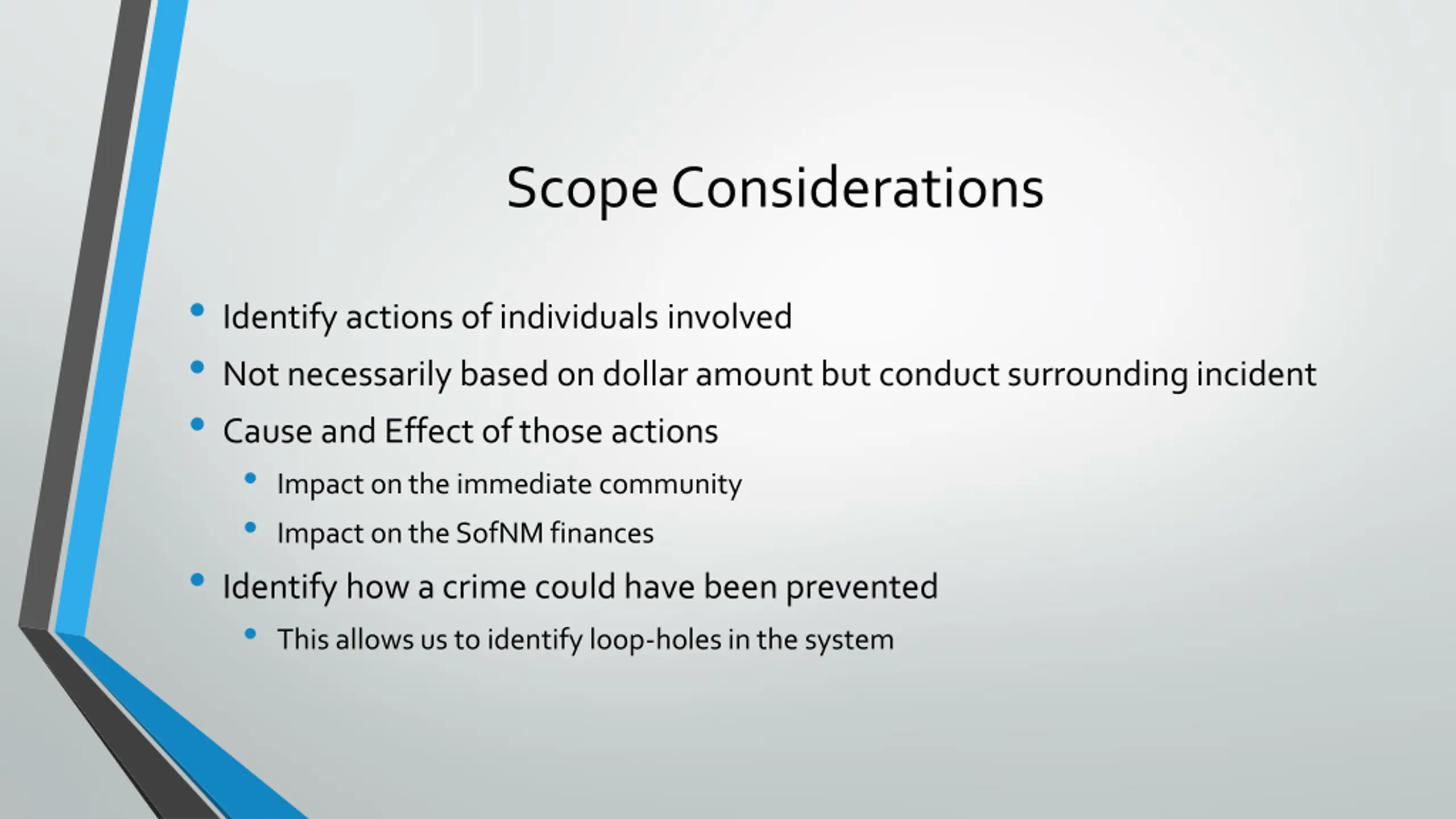 Scope Considerations Identify actions of individuals involved Not necessarily based on dollar amount but conduct surrounding incident Cause and Effect of those actions Impact on the immediate community Impact on the SofNM finances Identify how a crime could have been prevented This allows us to identify loop-holes in the system
