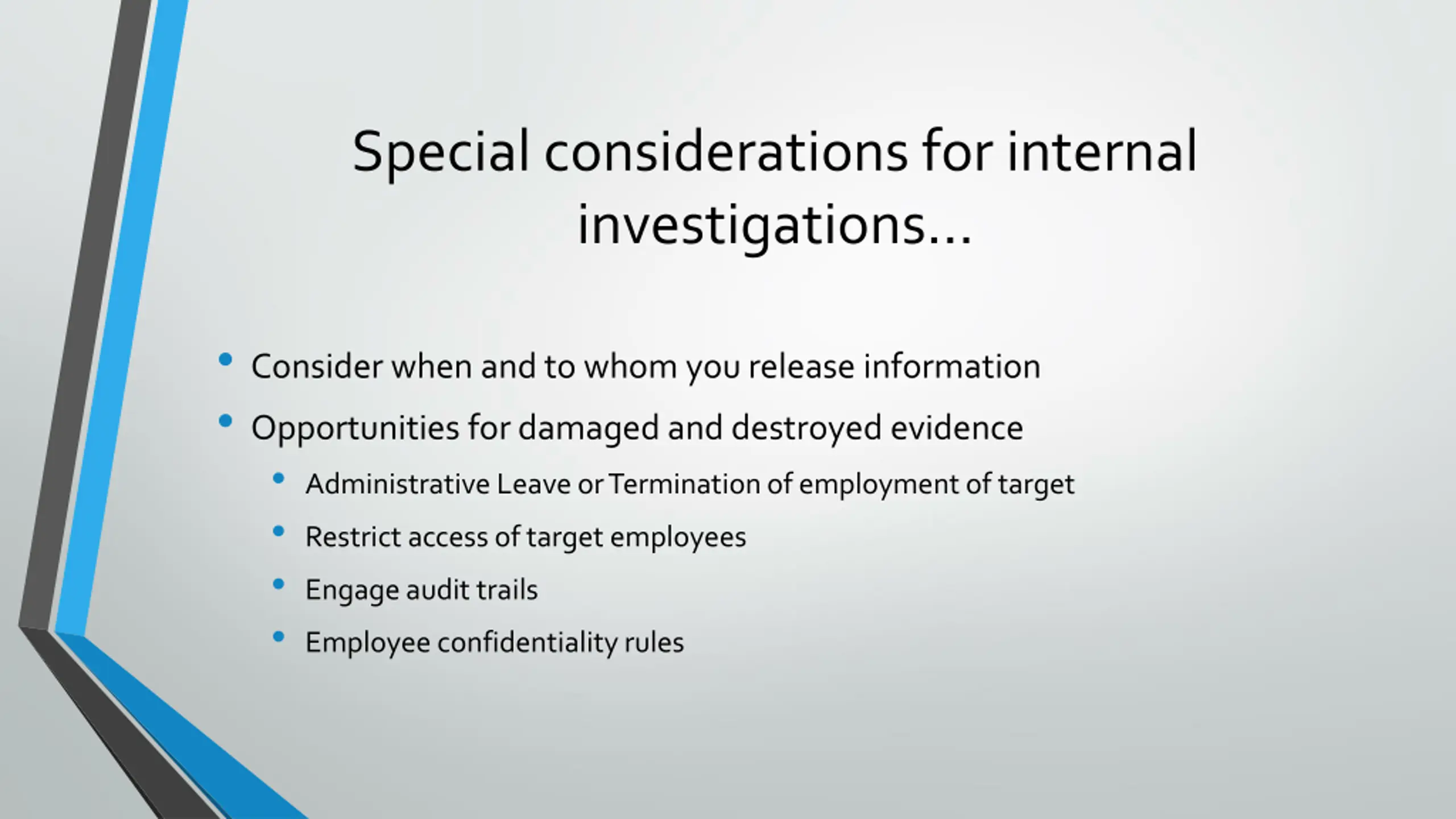 Special considerations for internal investigations Consider when and to whom you release information Opportunities for damaged and destroyed evidence Administrative Leave or Termination of employment of target Restrict access of target employees Engage audit trails Employee confidentiality rules
