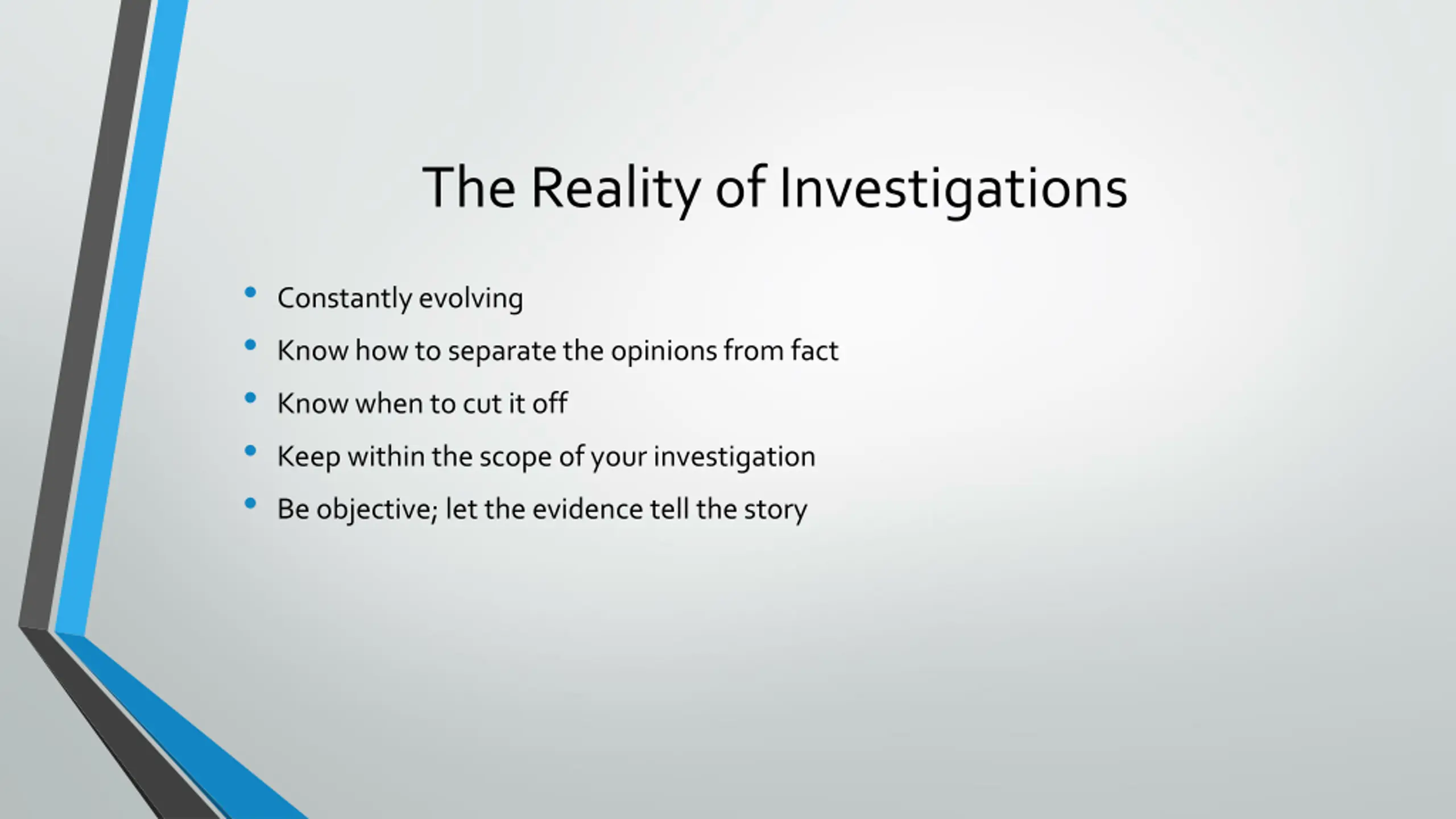 The Reality of Investigations Constantly evolving Know how to separate the opinions from fact Know when to cut it off Keep within the scope of your investigation Be objective; let the evidence tell the story