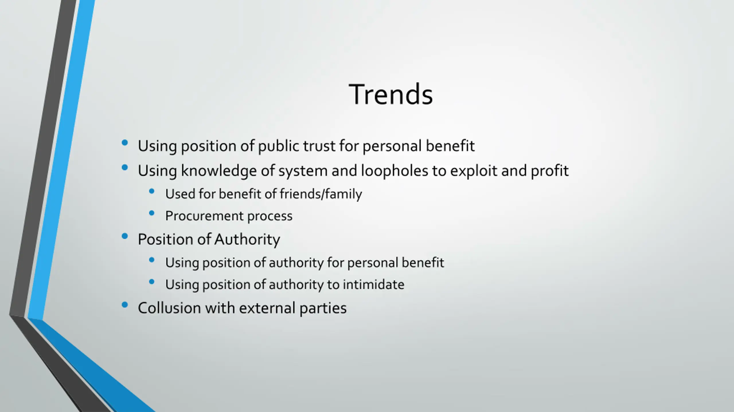 Trends Using position of public trust for personal benefit Using knowledge of system and loopholes to exploit and profit Used for benefit of friends/family Procurement process Position of Authority Using position of authority for personal benefit Using position of authority to intimidate Collusion with external parties