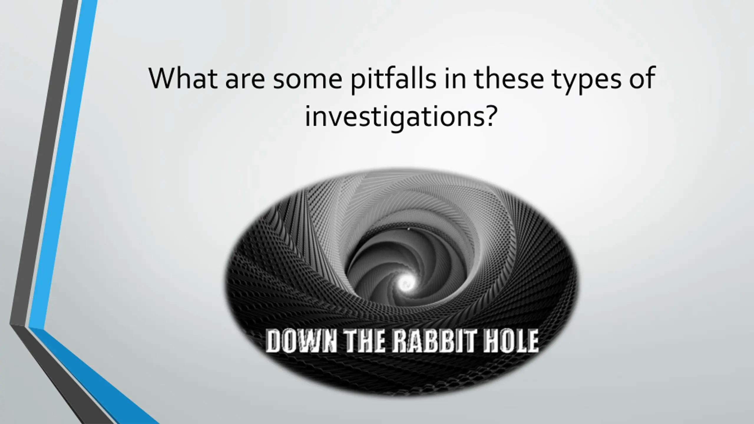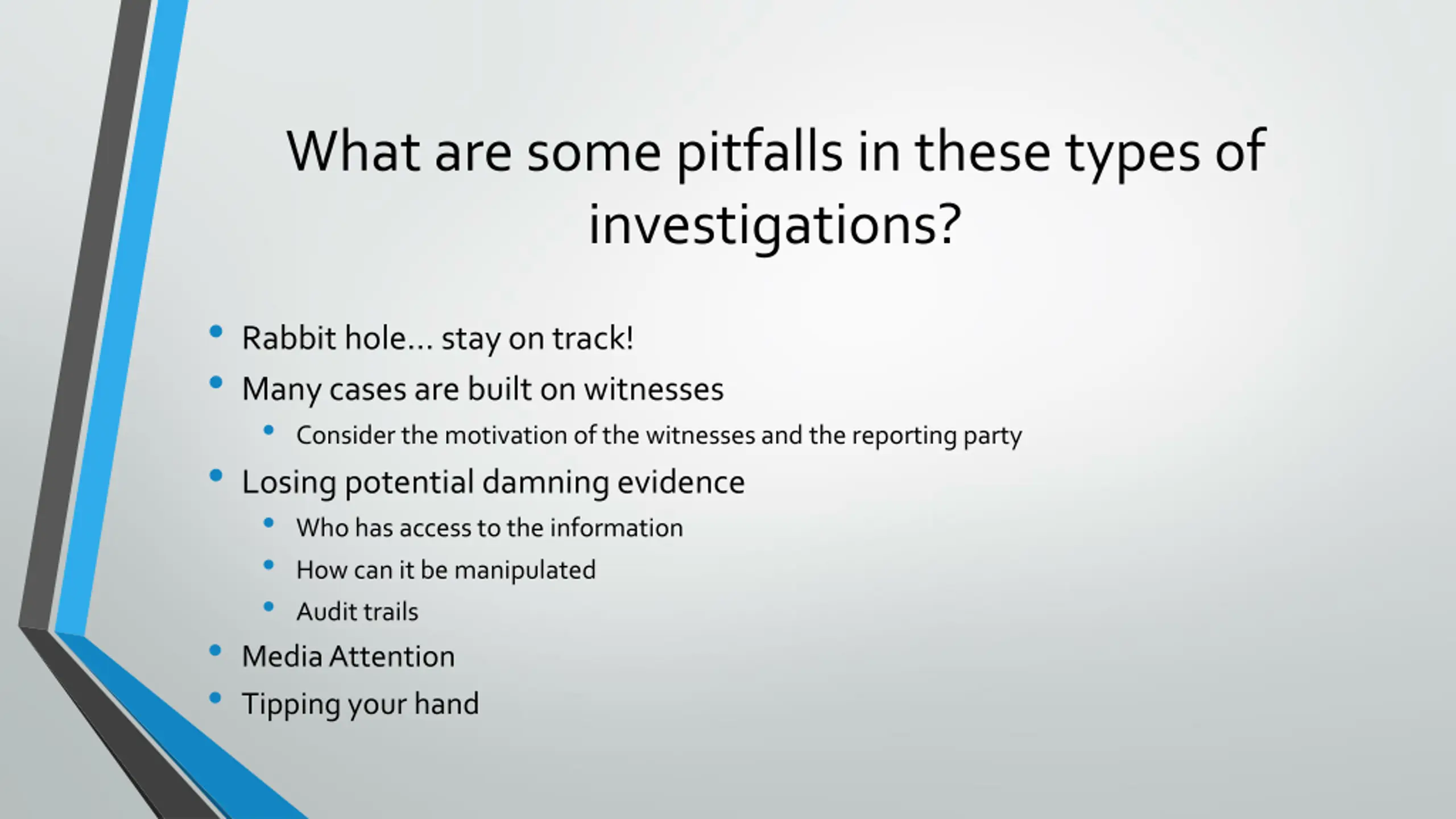 What are some pitfalls in these types of investigations? Rabbit hole stay on track! Many cases are built on witnesses Consider the motivation of the witnesses and the reporting party Losing potential damning evidence Who has access to the information How can it be manipulated Audit trails Media Attention Tipping your hand