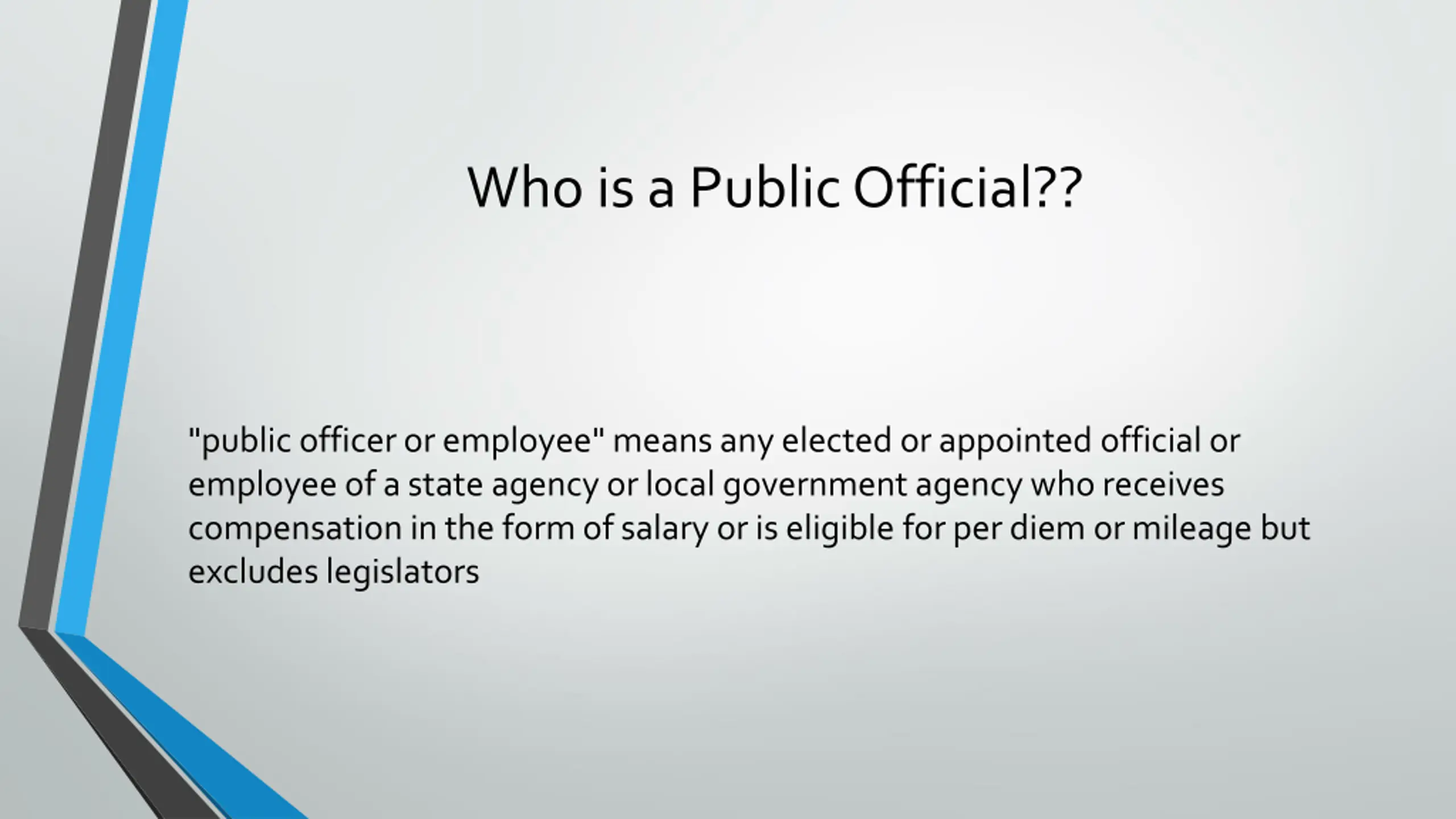 Who is a Public Official?? "public officer or employee" means any elected or appointed official or employee of a state agency or local government agency who receives compensation in the form of salary or is eligible for per diem or mileage but excludes legislators