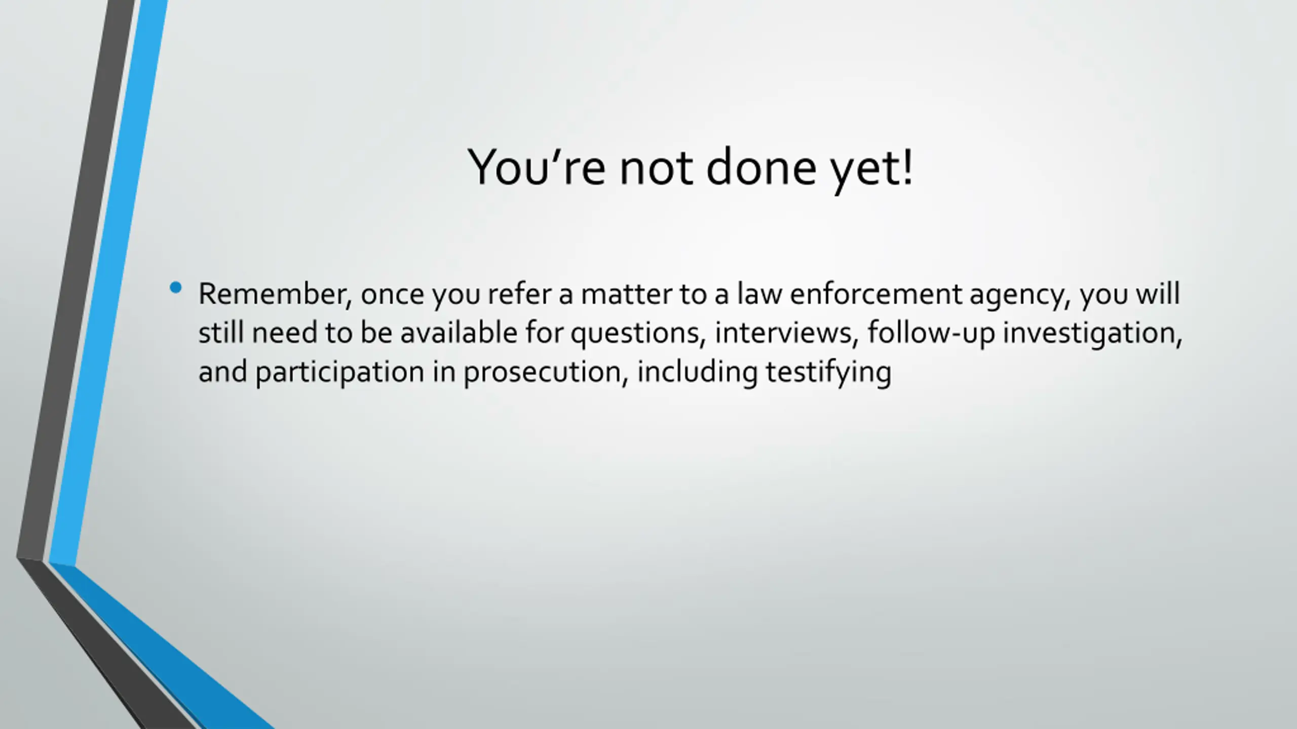 Youre not done yet! Remember, once you refer a matter to a law enforcement agency, you will still need to be available for questions, interviews, follow-up investigation, and participation in prosecution, including testifying