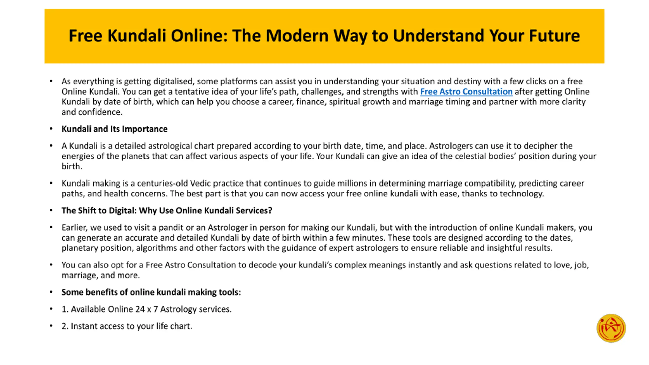 Free Kundali Online: The Modern Way to Understand Your Future As everything is getting digitalised, some platforms can assist you in understanding your situation and destiny with a few clicks on a free Online Kundali. You can get a tentative idea of your life s path, challenges, and strengths with FreeAstro Consultation after getting Online Kundali by date of birth, which can help you choose a career, finance, spiritual growth and marriage timing and partner with more clarity and confidence. Kundali and Its Importance A Kundali is a detailed astrological chart prepared according to your birth date, time, and place. Astrologers can use it to decipher the energies of the planets that can affect various aspects of your life. Your Kundali can give an idea of the celestial bodies position during your birth. Kundali making is a centuries-old Vedic practice that continues to guide millions in determining marriage compatibility, predicting career paths, and health concerns. The best part is that you can now access your free online kundali with ease, thanks to technology. The Shift to Digital: Why Use Online Kundali Services? Earlier, we used to visit a pandit or an Astrologer in person for making our Kundali, but with the introduction of online Kundali makers, you can generate an accurate and detailed Kundali by date of birth within a few minutes. These tools are designed according to the dates, planetary position, algorithms and other factors with the guidance of expert astrologers to ensure reliable and insightful results. You can also opt for a Free Astro Consultation to decode your kundali s complex meanings instantly and ask questions related to love, job, marriage, and more. Some benefits of online kundali making tools: 1. Available Online 24 x 7 Astrology services. 2. Instant access to your life chart.
