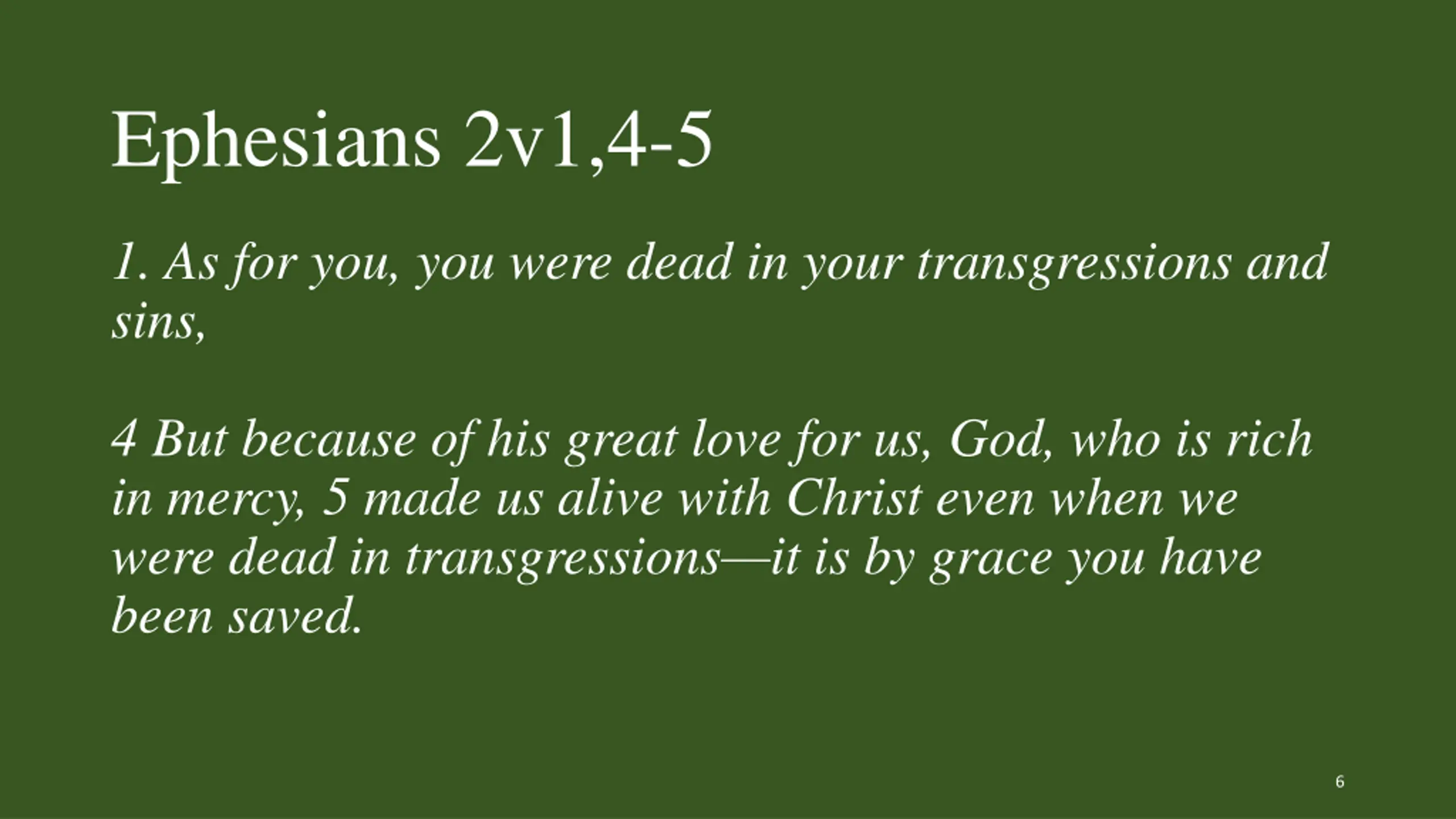 Ephesians 2v1,4-5 1. As for you, you were dead in your transgressions and sins, 4 But because of his great love for us, God, who is rich in mercy, 5 made us alive with Christ even when we were dead in transgressions it is by grace you have been saved. 6