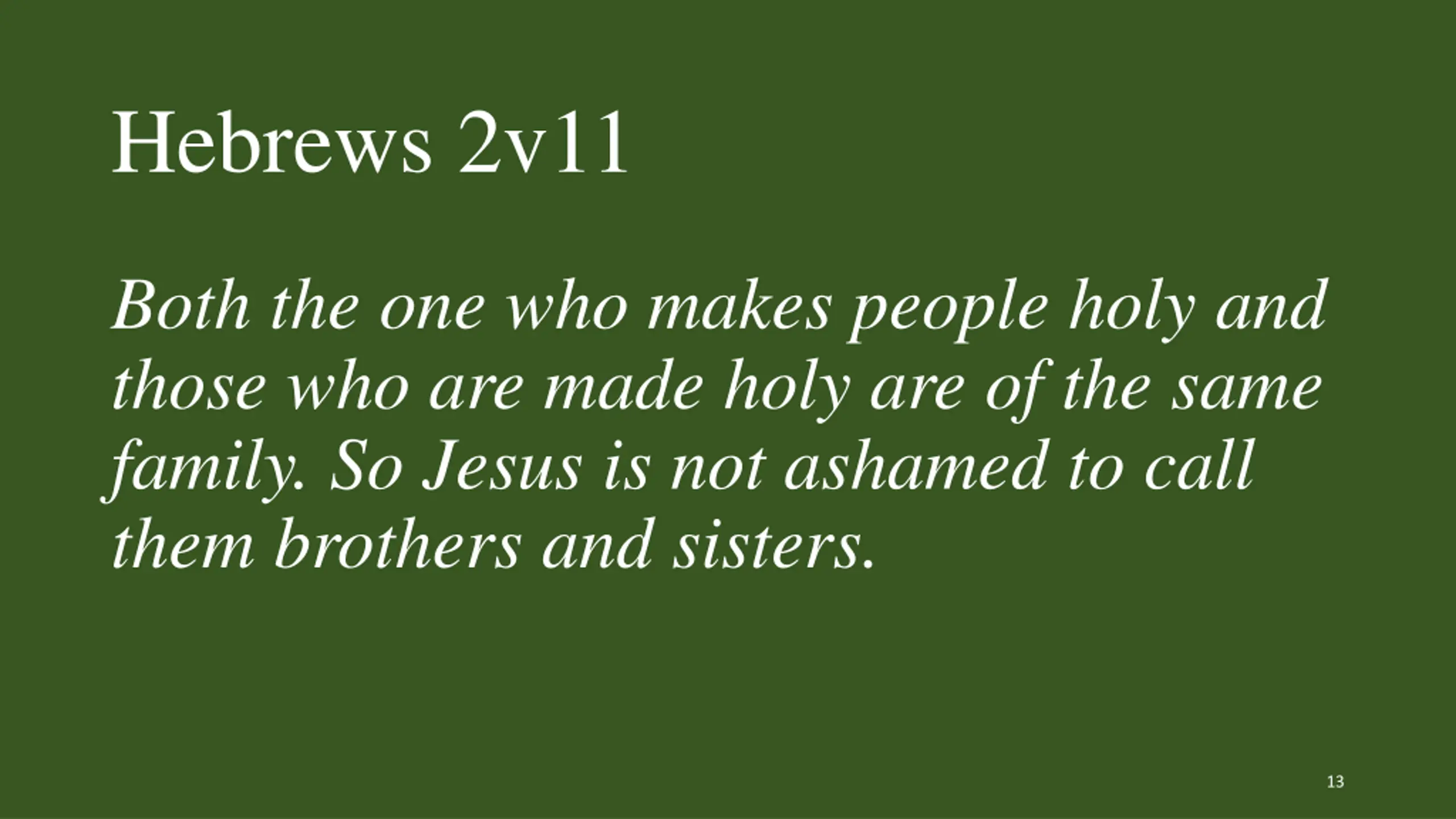 Hebrews 2v11 Both the one who makes people holy and those who are made holy are of the same family. So Jesus is not ashamed to call them brothers and sisters. 13