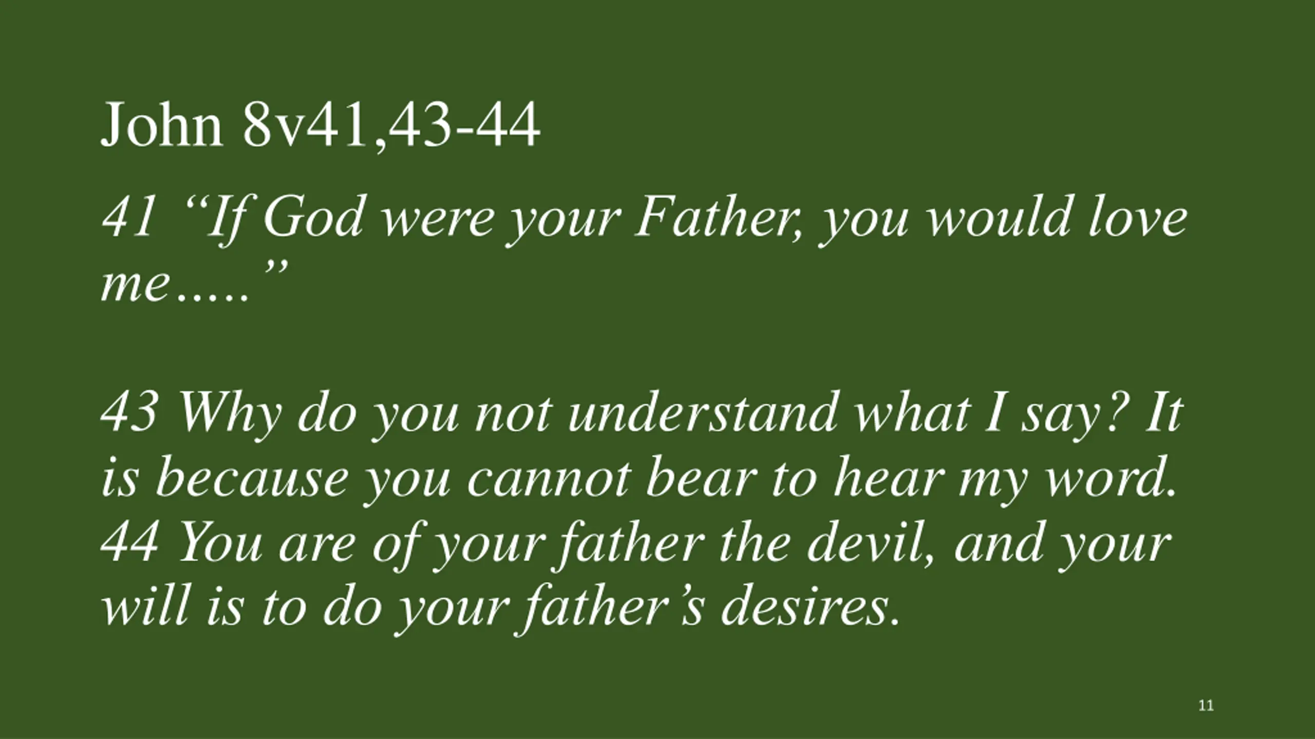 John 8v41,43-44 41 If God were your Father, you would love me .. 43 Why do you not understand what I say? It is because you cannot bear to hear my word. 44 You are of your father the devil, and your will is to do your father s desires. 11