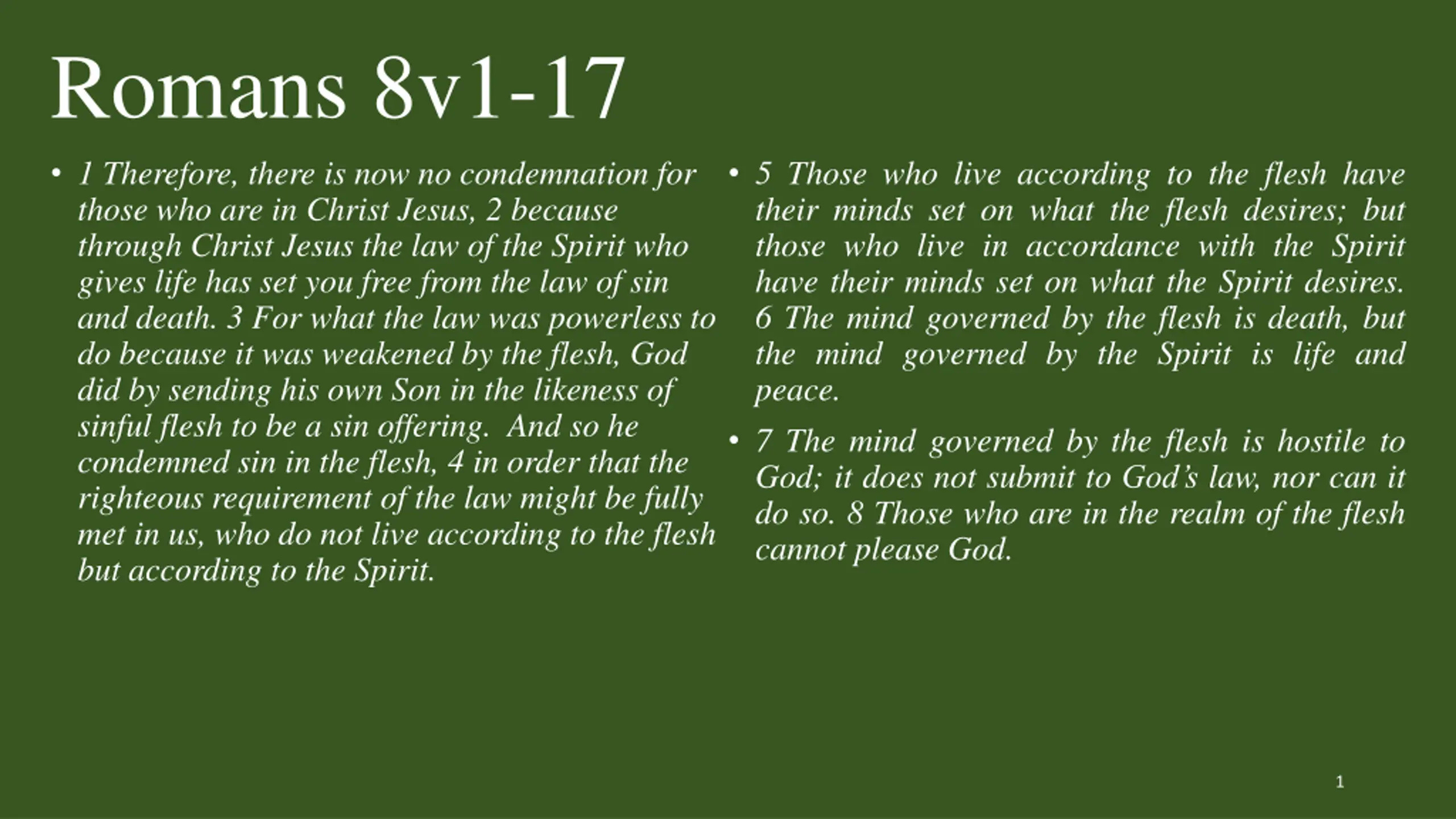 Romans 8v1-17 1 Therefore, there is now no condemnation for those who are in Christ Jesus, 2 because through Christ Jesus the law of the Spirit who gives life has set you free from the law of sin and death. 3 For what the law was powerless to do because it was weakened by the flesh, God did by sending his own Son in the likeness of sinful flesh to be a sin offering. And so he condemned sin in the flesh, 4 in order that the righteous requirement of the law might be fully met in us, who do not live according to the flesh but according to the Spirit. 5 Those who live according to the flesh have their minds set on what the flesh desires; but those who live in accordance with the Spirit have their minds set on what the Spirit desires. 6 The mind governed by the flesh is death, but the mind governed by the Spirit is life and peace. 7 The mind governed by the flesh is hostile to God; it does not submit to God s law, nor can it do so. 8 Those who are in the realm of the flesh cannot please God. 1