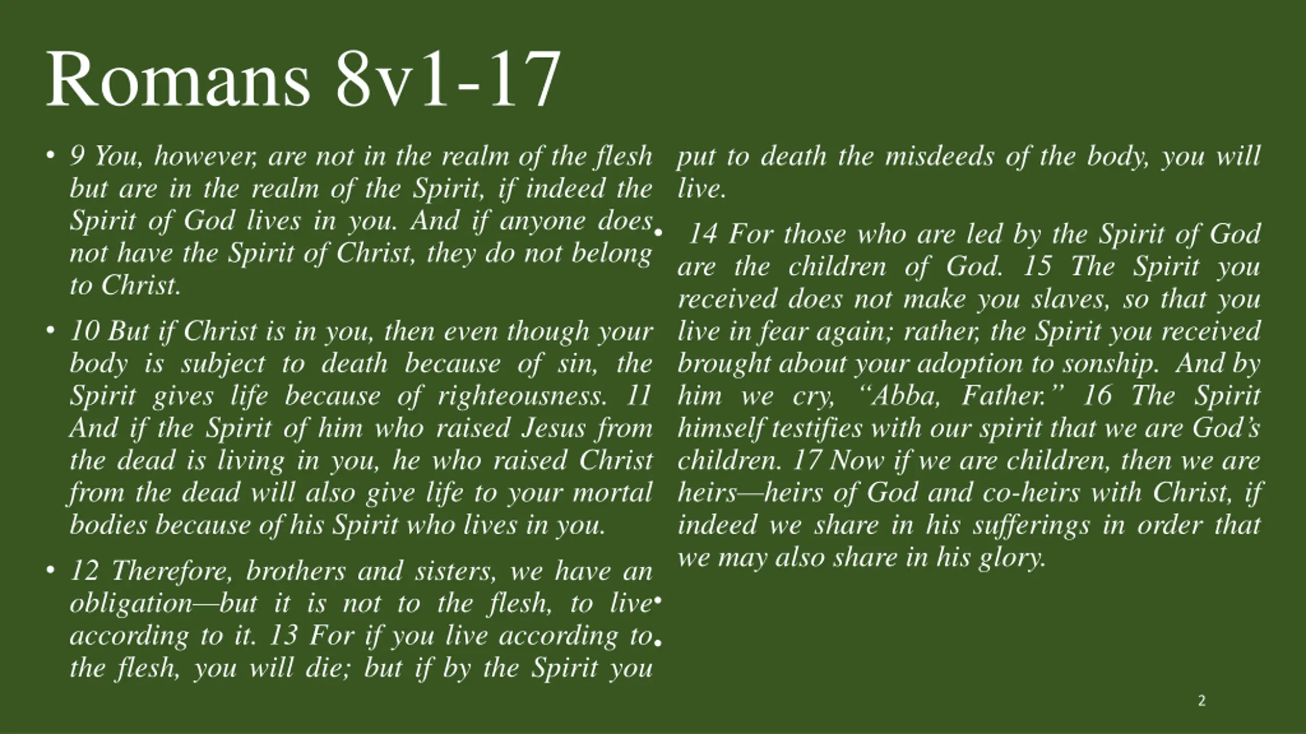 Romans 8v1-17 9 You, however, are not in the realm of the flesh but are in the realm of the Spirit, if indeed the Spirit of God lives in you. And if anyone does not have the Spirit of Christ, they do not belong to Christ. 10 But if Christ is in you, then even though your body is subject to death because of sin, the Spirit gives life because of righteousness. 11 And if the Spirit of him who raised Jesus from the dead is living in you, he who raised Christ from the dead will also give life to your mortal bodies because of his Spirit who lives in you. 12 Therefore, brothers and sisters, we have an obligation but it is not to the flesh, to live according to it. 13 For if you live according to the flesh, you will die; but if by the Spirit you put to death the misdeeds of the body, you will live. 14 For those who are led by the Spirit of God are the children of God. 15 The Spirit you received does not make you slaves, so that you live in fear again; rather, the Spirit you received brought about your adoption to sonship. And by him we cry, Abba, Father. 16 The Spirit himself testifies with our spirit that we are God s children. 17 Now if we are children, then we are heirs heirs of God and co-heirs with Christ, if indeed we share in his sufferings in order that we may also share in his glory. 2