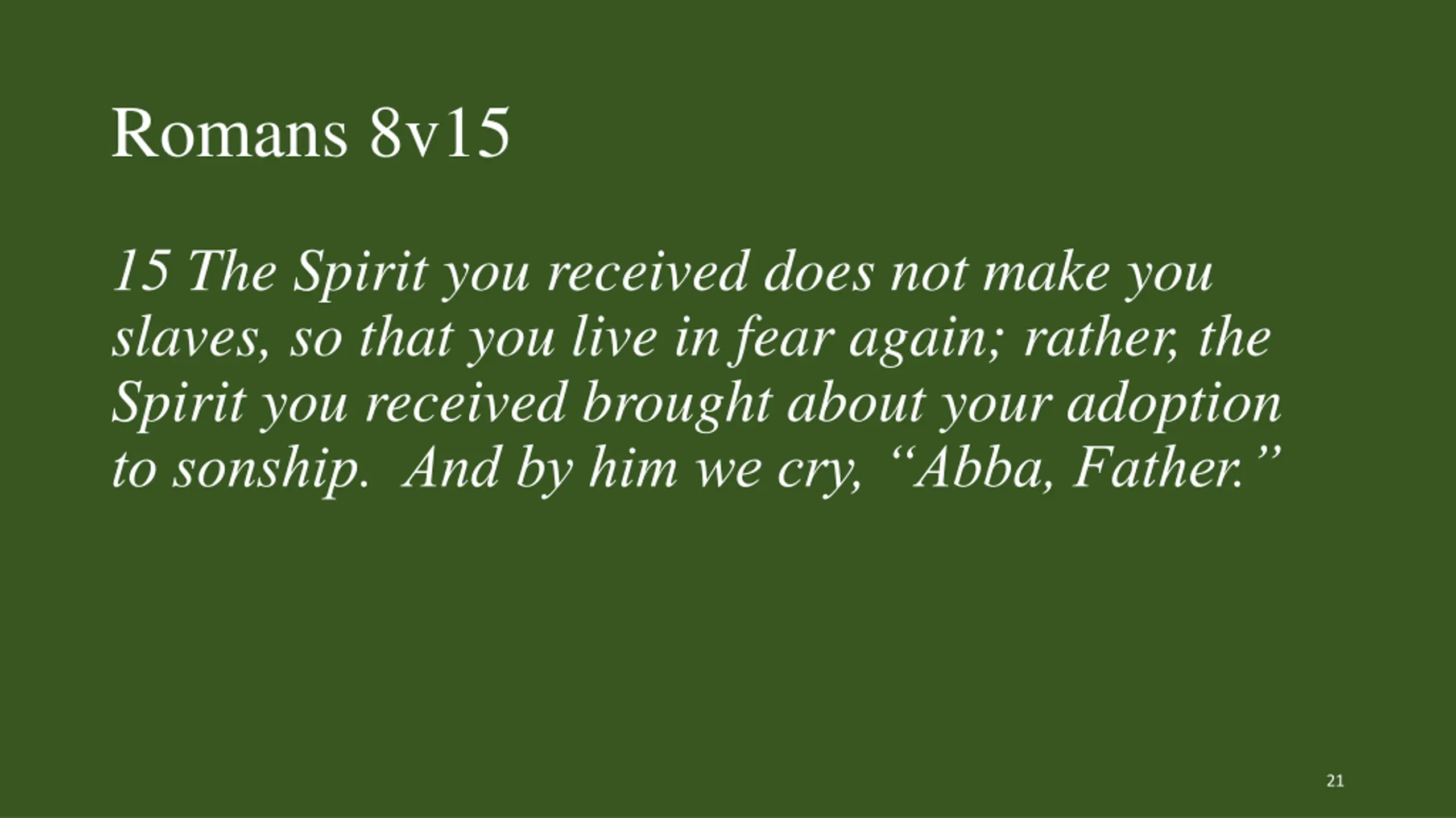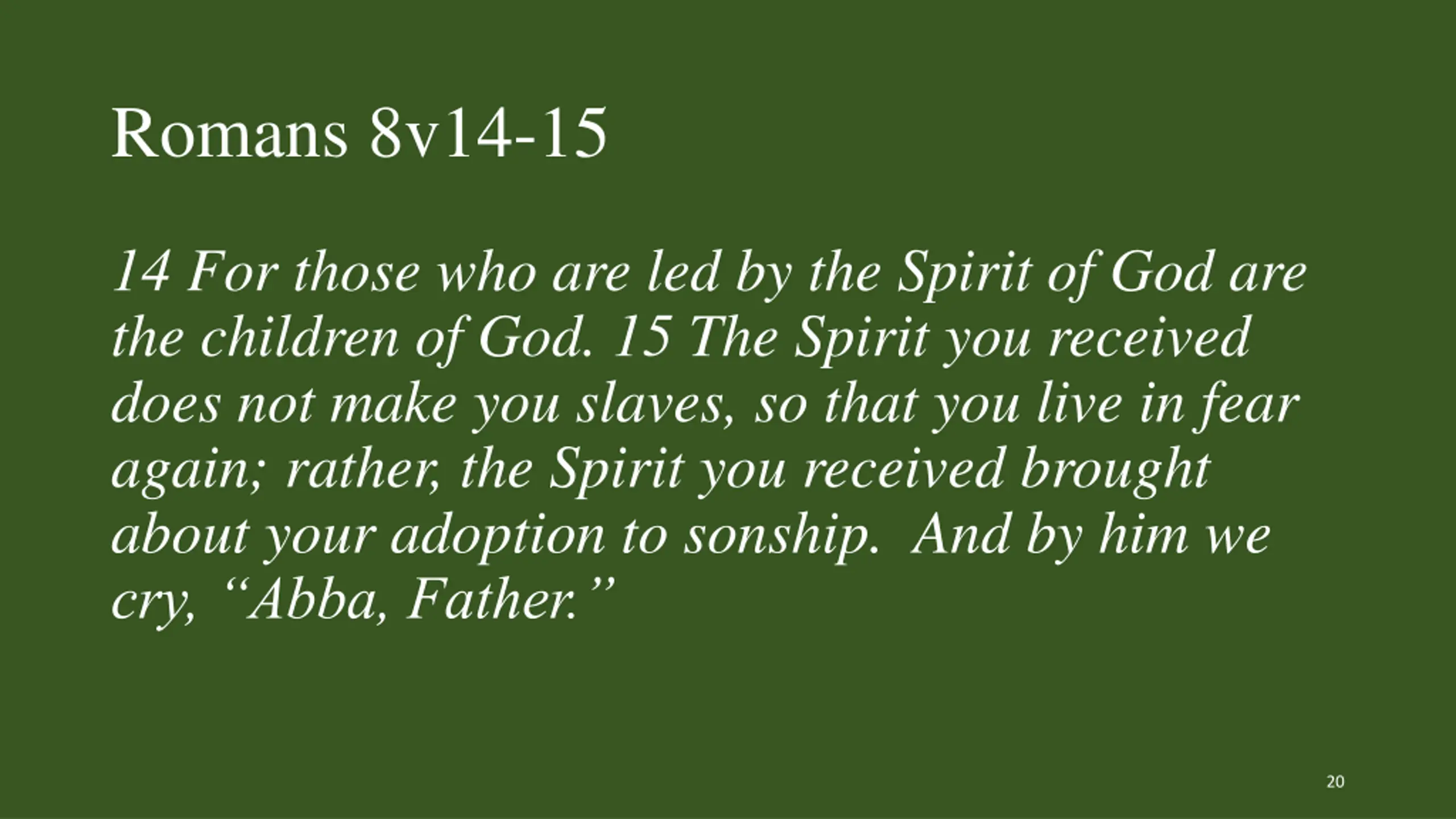 Romans 8v14-15 14 For those who are led by the Spirit of God are the children of God. 15 The Spirit you received does not make you slaves, so that you live in fear again; rather, the Spirit you received brought about your adoption to sonship. And by him we cry, Abba, Father. 20